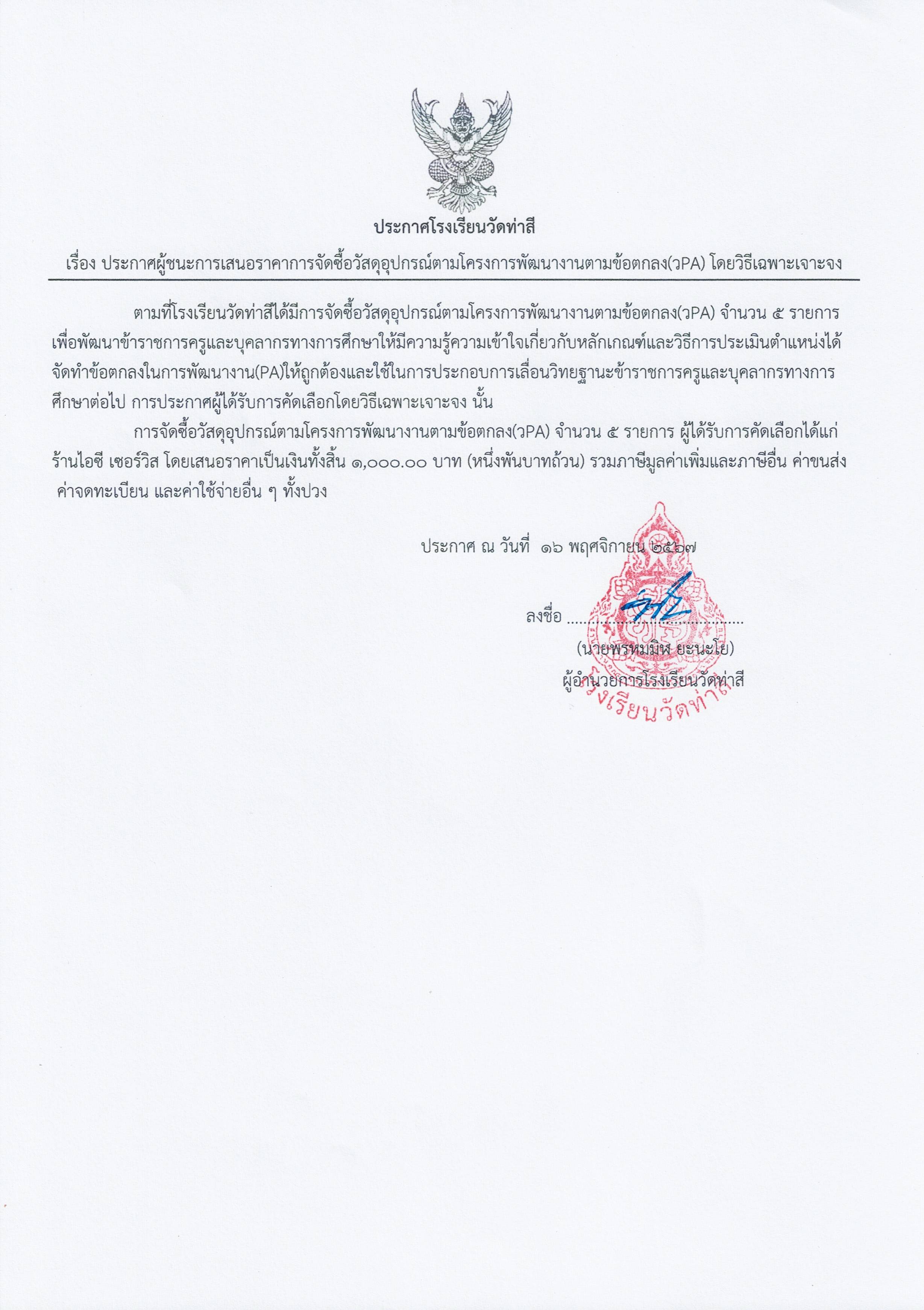 ประกาศผู้ชนะการเสนอราคา รายการจัดซื้อวัสดุอุปกรณ์ตามโครงการพัฒนางานตามข้อตกลง(วPA) โดยวิธีเฉพาะเจาะจง
