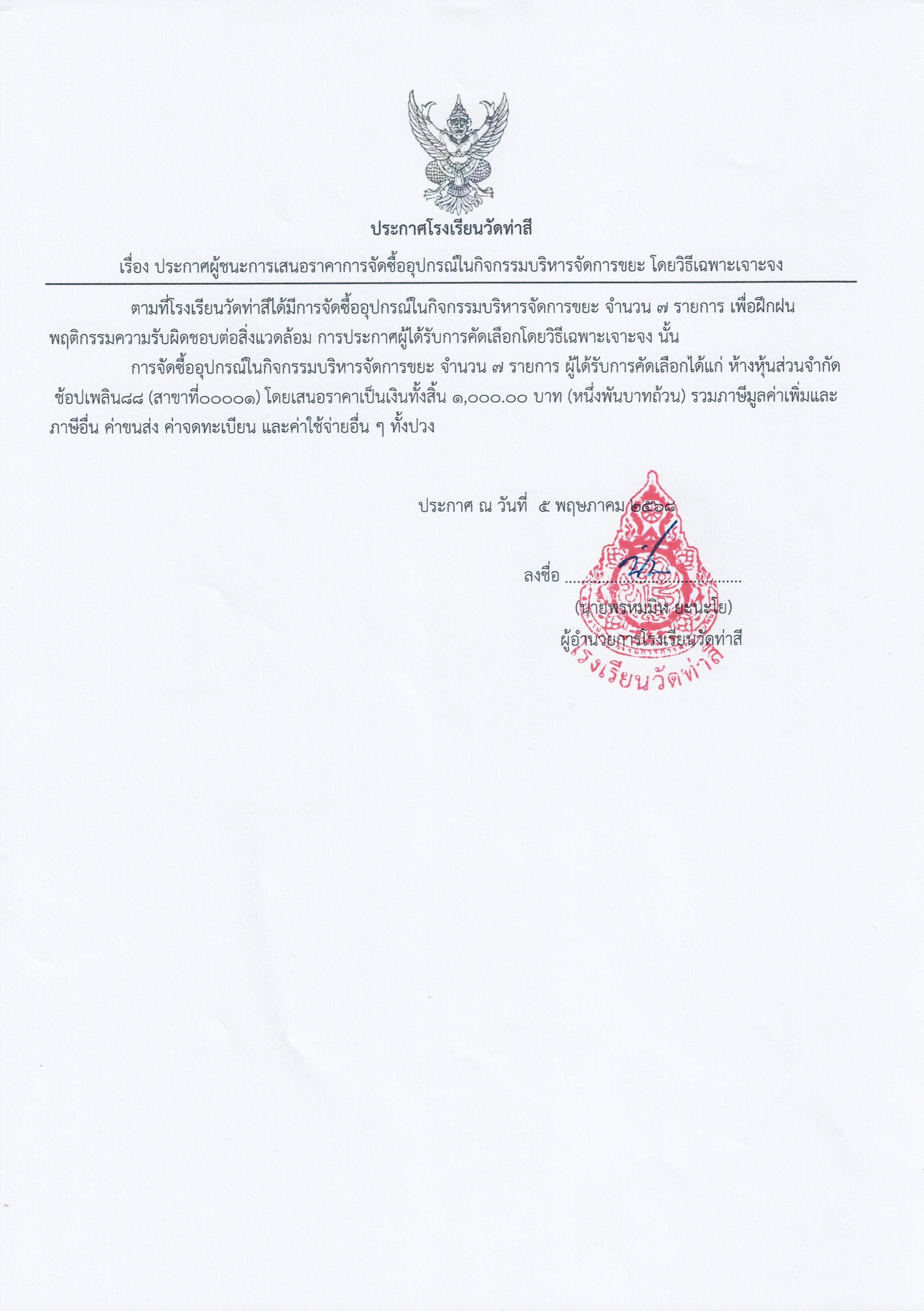 ประกาศผู้ชนะการเสนอราคาการจัดซื้ออุปกรณ์ในกิจกรรมบริหารจัดการขยะ