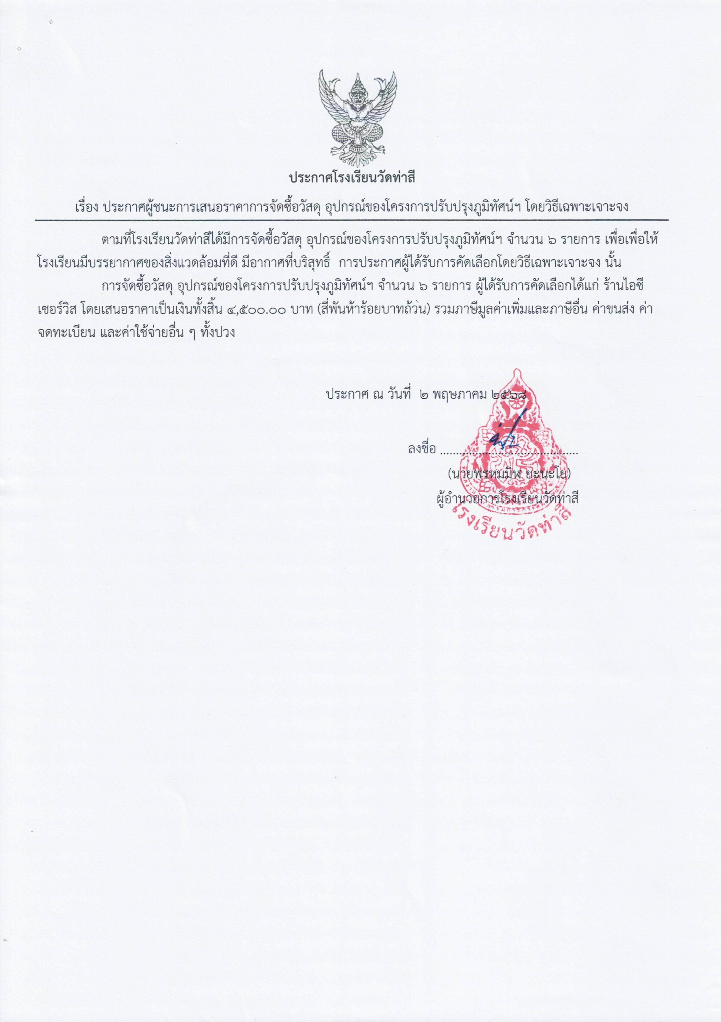 ประกาศผู้ชนะการเสนอราคาการจัดซื้อวัสดุ อุปกรณ์ของโครงการปรับปรุงภูมิทัศน์ฯ