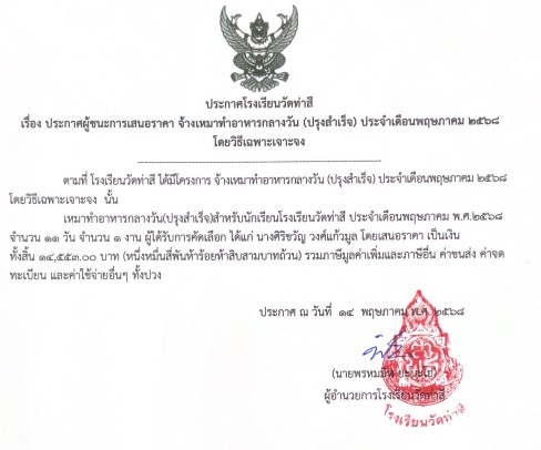 ประกาศผู้ชนะการเสนอราคา จ้างเหมาทำอาหารกลางวัน (ปรุงสำเร็จ) ประจำเดือนพฤษภาคม ๒๕๖8 โดยวิธีเฉพาะเจาะจง