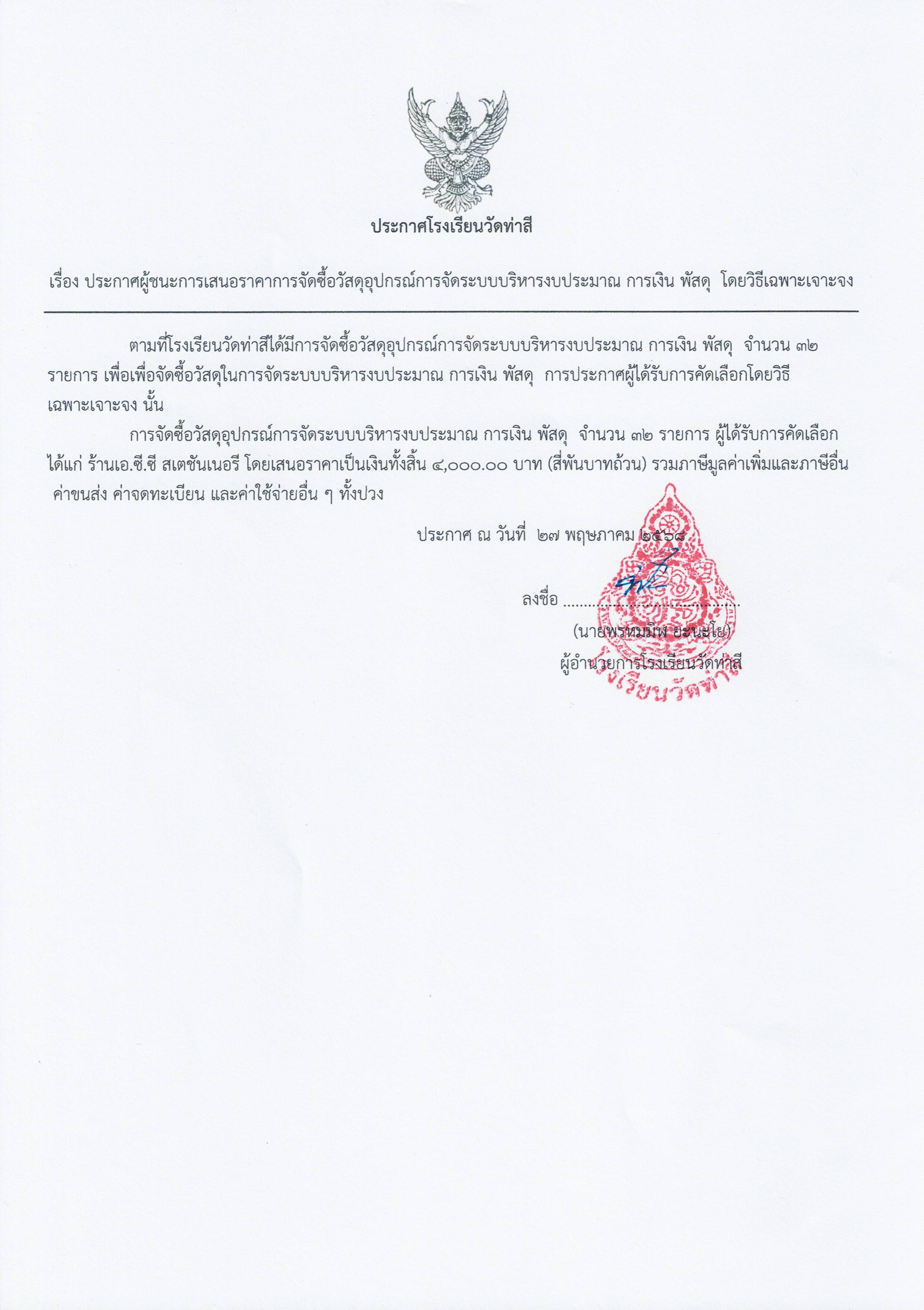ประกาศผู้ชนะการเสนอราคาการจัดซื้อวัสดุอุปกรณ์การจัดระบบบริหารงบประมาณ การเงิน พัสดุ
