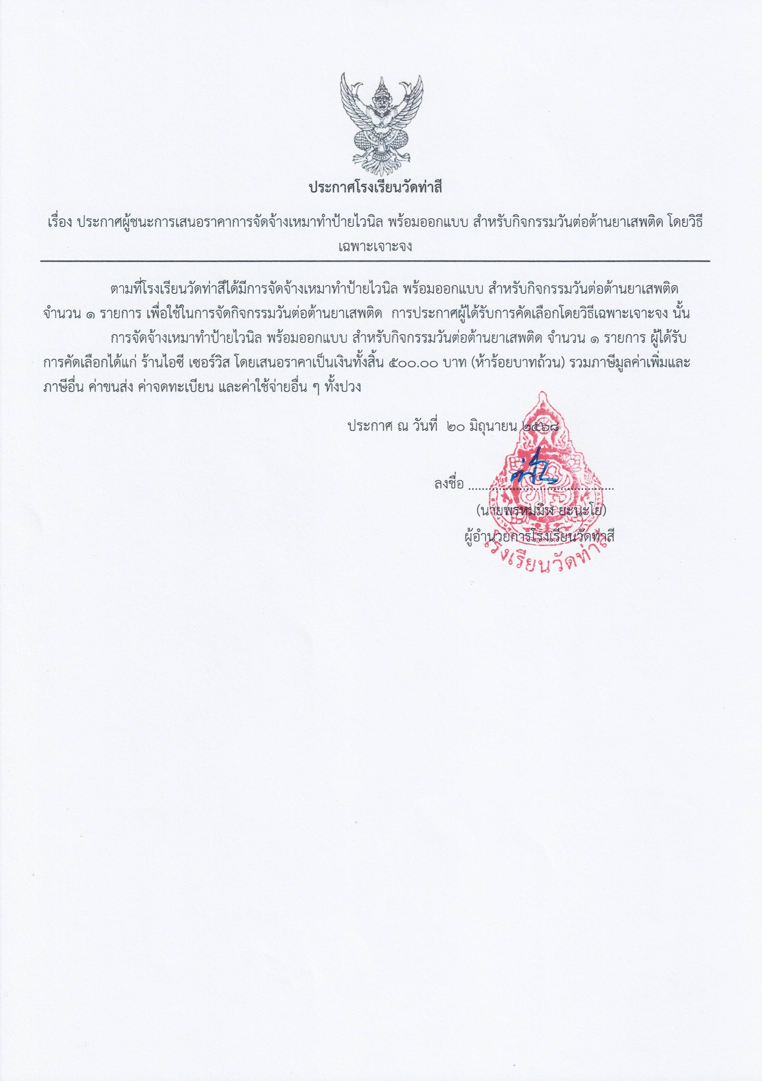 ประกาศผู้ชนะการเสนอราคาการจัดจ้างเหมาทำป้ายไวนิล พร้อมออกแบบ สำหรับกิจกรรมวันต่อต้านยาเสพติดในโครงการโครงการส่งเสริมกิจกรรมวันสำคัญ