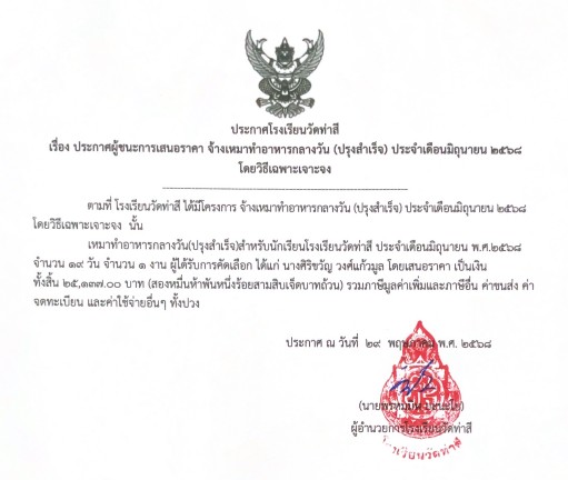 ประกาศผู้ชนะการเสนอราคา จ้างเหมาทำอาหารกลางวัน (ปรุงสำเร็จ) ประจำเดือนมิถุนายน ๒๕๖8 โดยวิธีเฉพาะเจาะจง