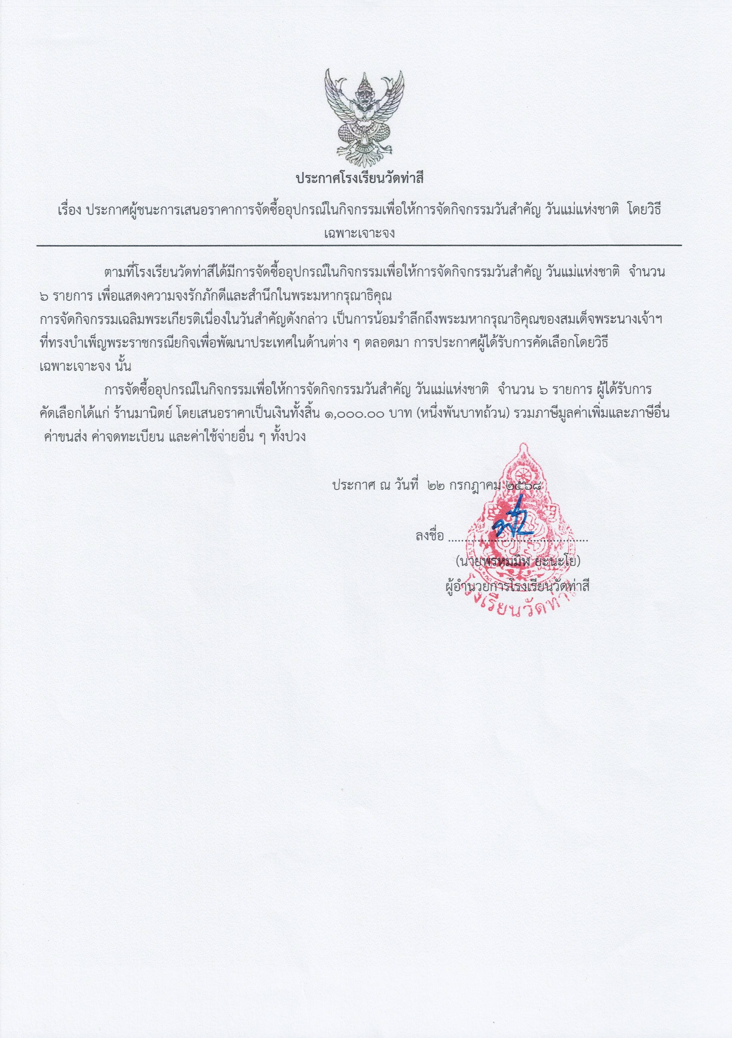 ประกาศผู้ชนะการเสนอราคาการจัดซื้ออุปกรณ์ในกิจกรรมเพื่อให้การจัดกิจกรรมวันสำคัญ วันแม่แห่งชาติ โดยวิธีเฉพาะเจาะจง โรงเรียนวัดท่าสี