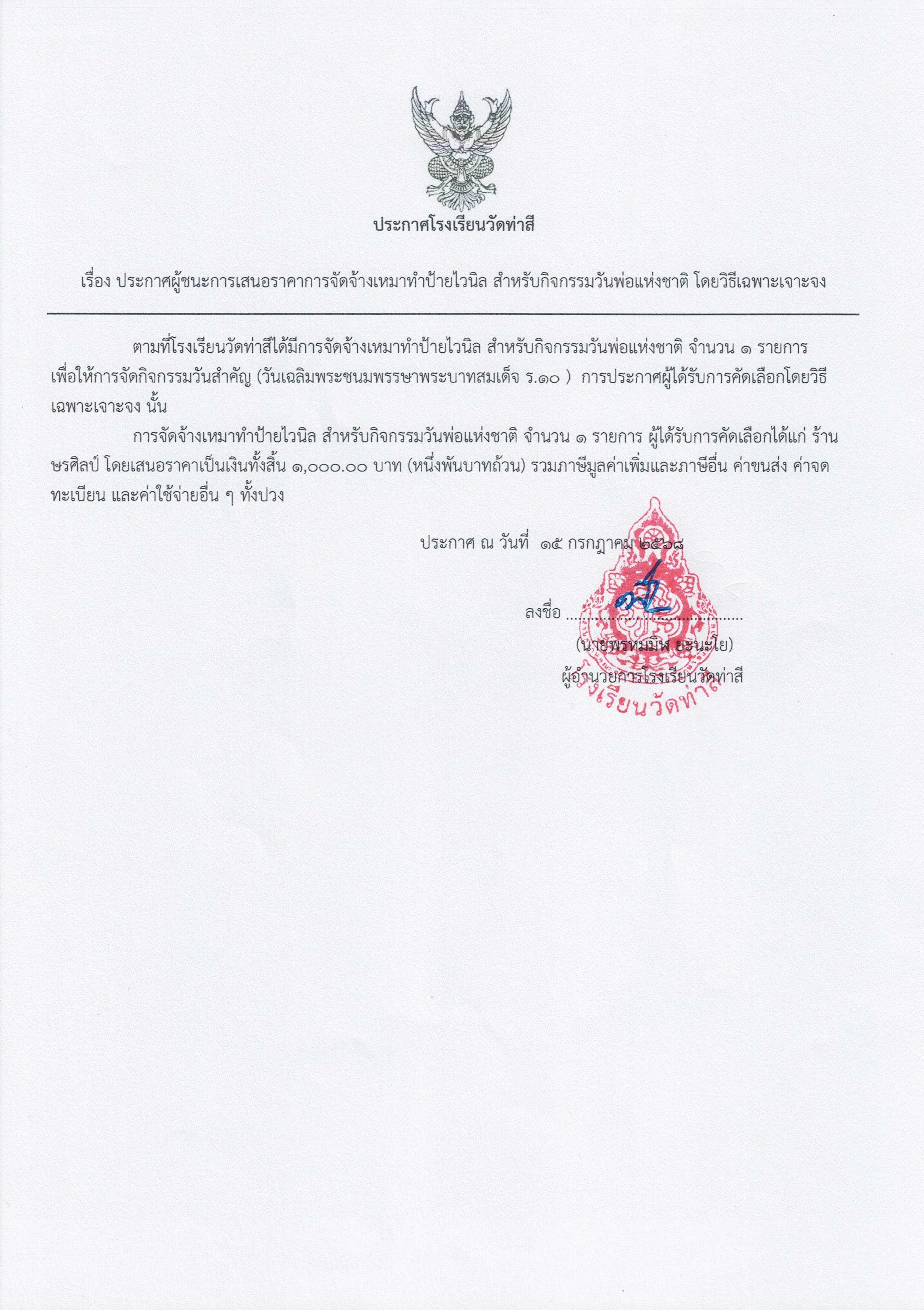 ประกาศผู้ชนะการเสนอราคาการจัดจ้างเหมาทำป้ายไวนิล สำหรับกิจกรรมวันพ่อแห่งชาติ โดยเฉพาะเจาะจง