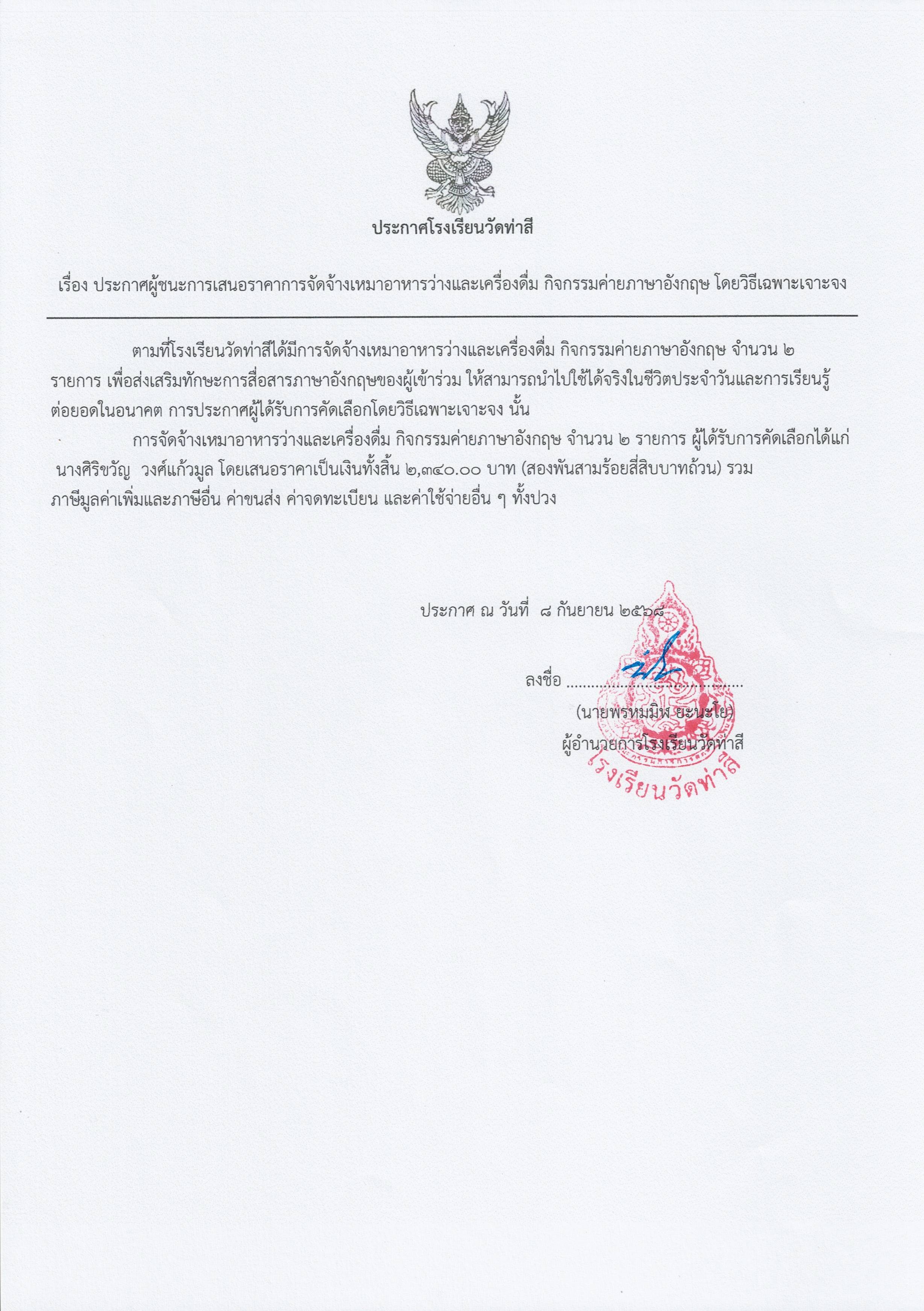 ประกาศผู้ชนะการเสนอราคาการจัดจ้างเหมาเหมาอาหารว่างและเครื่องดื่ม กิจกรรมค่ายภาษาอังกฤษ โดยเฉพาะเจาะจง