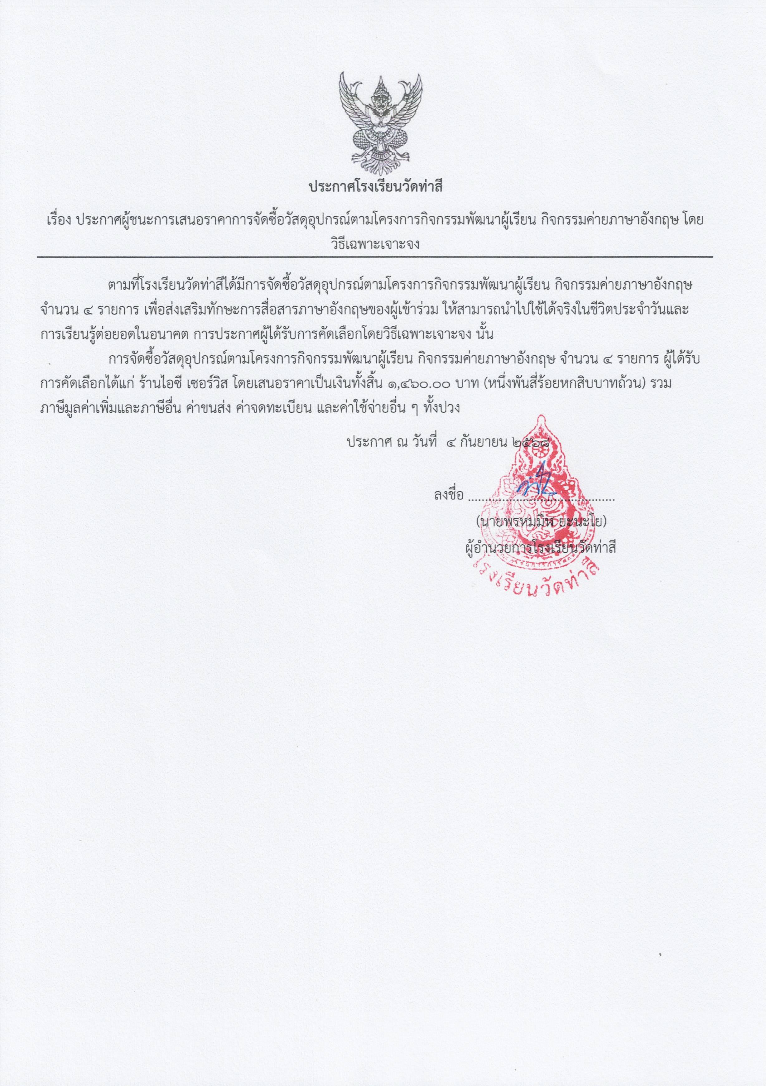 ประกาศผู้ชนะการเสนอราคาการจัดซื้อวัสดุอุปกรณ์ตามโครงการกิจกรรมพัฒนาผู้เรียน กิจกรรมค่ายภาษาอังกฤษ โดยเฉพาะเจาะจง