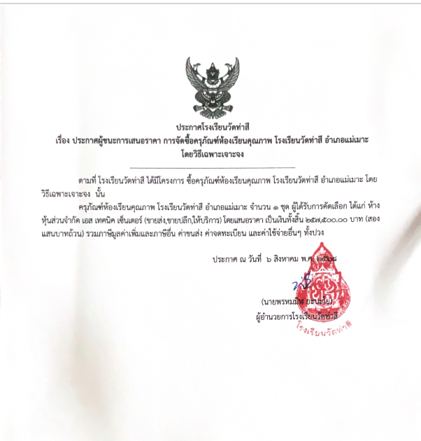 ประกาศผลผู้ชนะการเสนอราคา รายการจัดซื้อครุภัณฑ์ห้องเรียนคุณภาพ โรงเรียนวัดท่าสี อำเภอแม่เมาะ