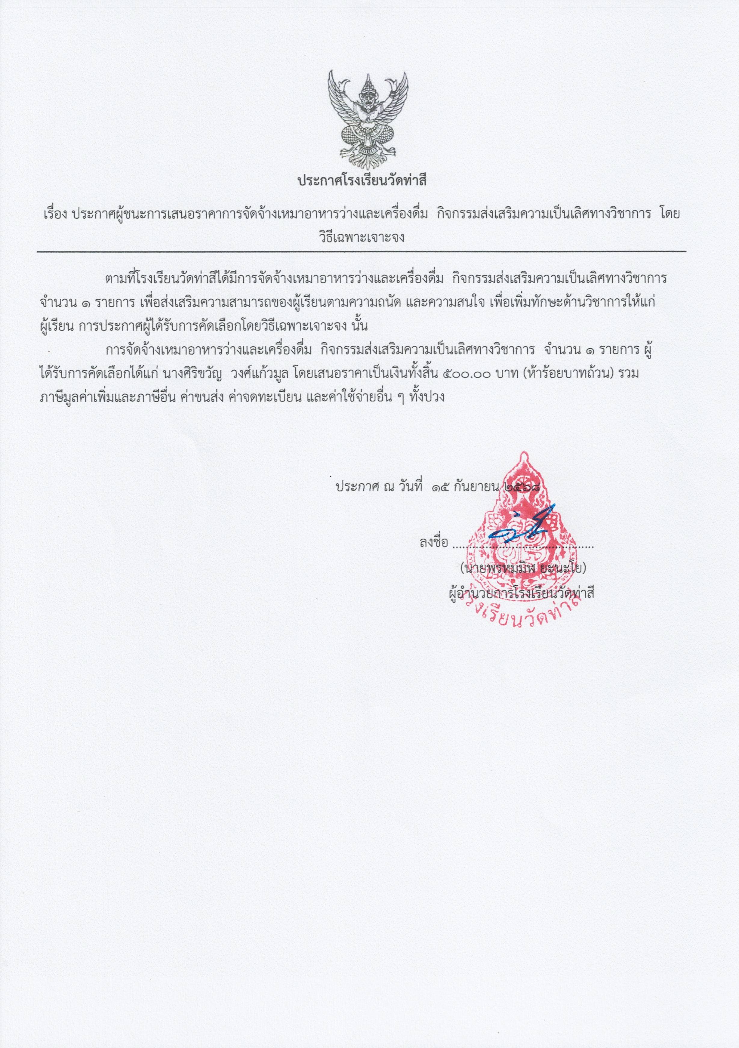 ประกาศผู้ชนะการเสนอราคาการจัดจ้างเหมาอาหารว่างและเครื่องดื่ม กิจกรรมส่งเสริมความเป็นเลิศทางวิชาการ โดยเฉพาะเจาะจง