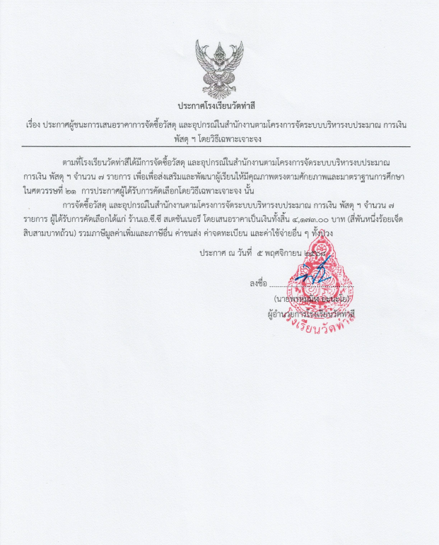 ประกาศผู้ชนะการเสนอราคาการจัดซื้อวัสดุ และอุปกรณ์ในสำนักงานตามโครงการจัดระบบบริหารงบประมาณ การเงิน พัสดุ ฯ โรงเรียนวัดท่าสี