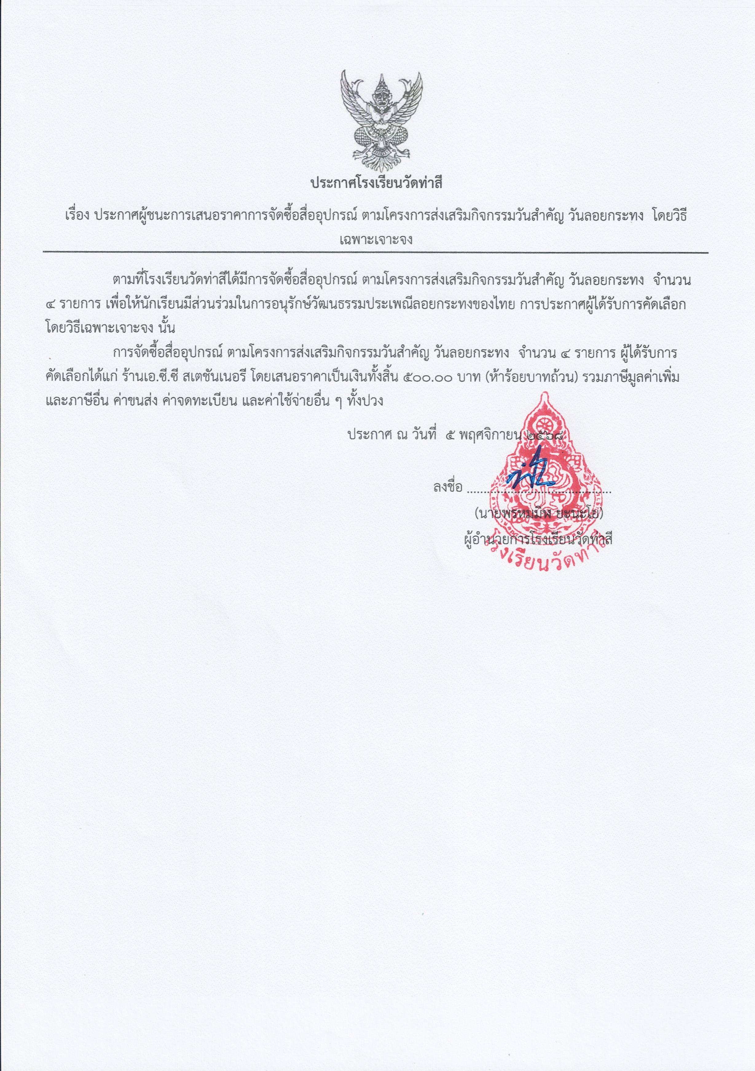 ประกาศผู้ชนะการเสนอราคาการจัดซื้อสื่ออุปกรณ์ ตามโครงการส่งเสริมกิจกรรมวันสำคัญ วันลอยกระทง โรงเรียนวัดท่าสี