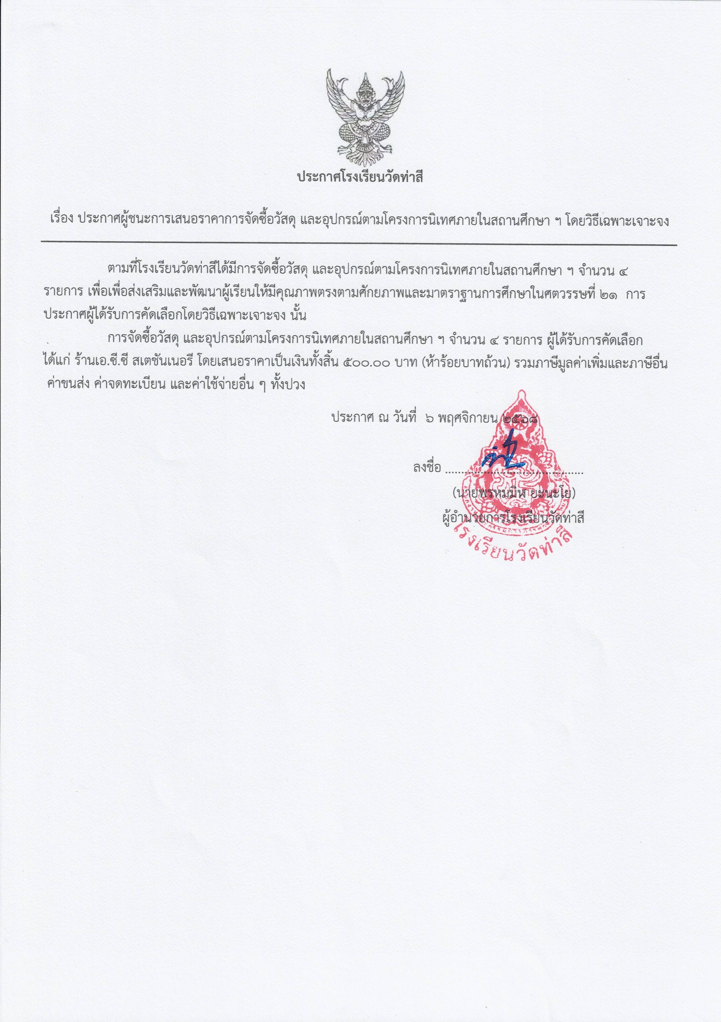 ประกาศผู้ชนะการเสนอราคาการจัดซื้อวัสดุ และอุปกรณ์ตามโครงการพัฒนาระบบประกันคุณภาพภายในสถานศึกษา ฯ โรงเรียนวัดท่าสี
