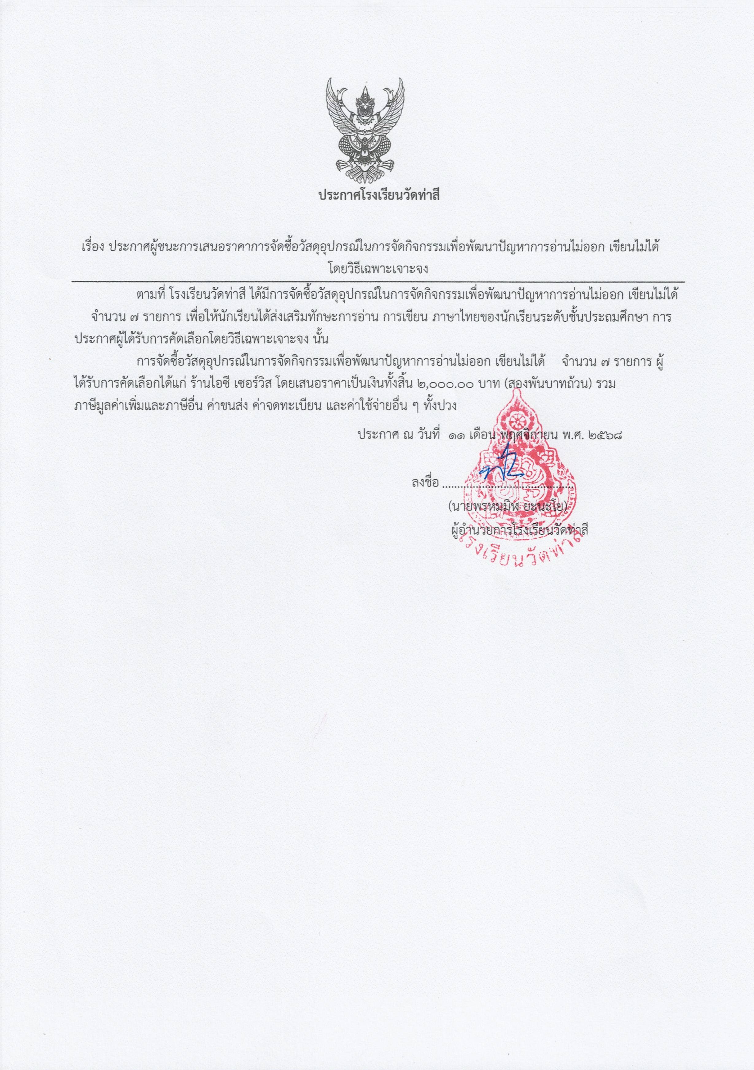 ประกาศผู้ชนะการเสนอราคาการจัดซื้อวัสดุอุปกรณ์ในการจัดกิจกรรมเพื่อพัฒนาปัญหาการอ่านไม่ออก เขียนไม่ได้