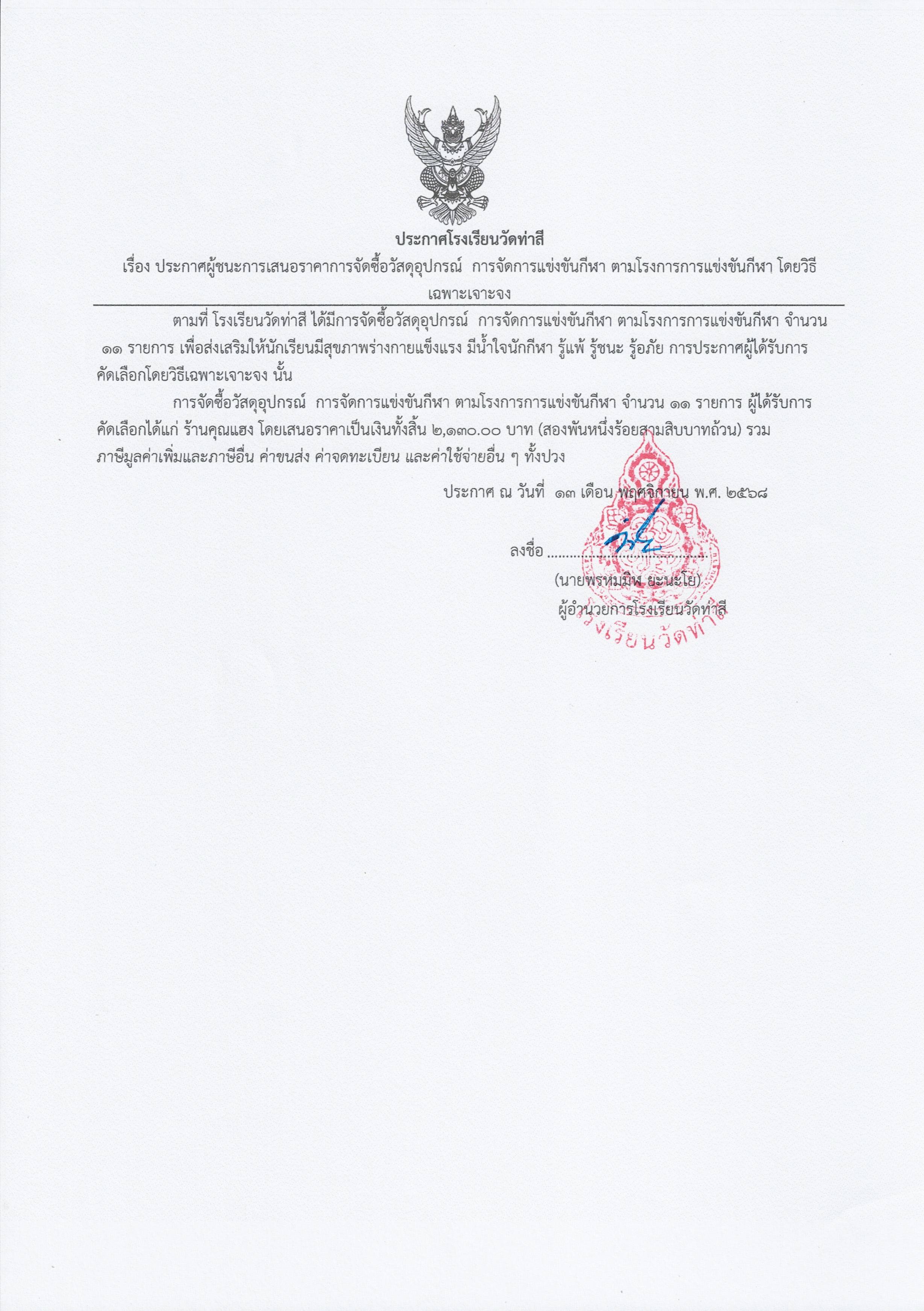 ประกาศผู้ชนะการเสนอราคาการจัดซื้อวัสดุอุปกรณ์ การจัดการแข่งขันกีฬา โดยวิธีเฉพาะเจาะจง