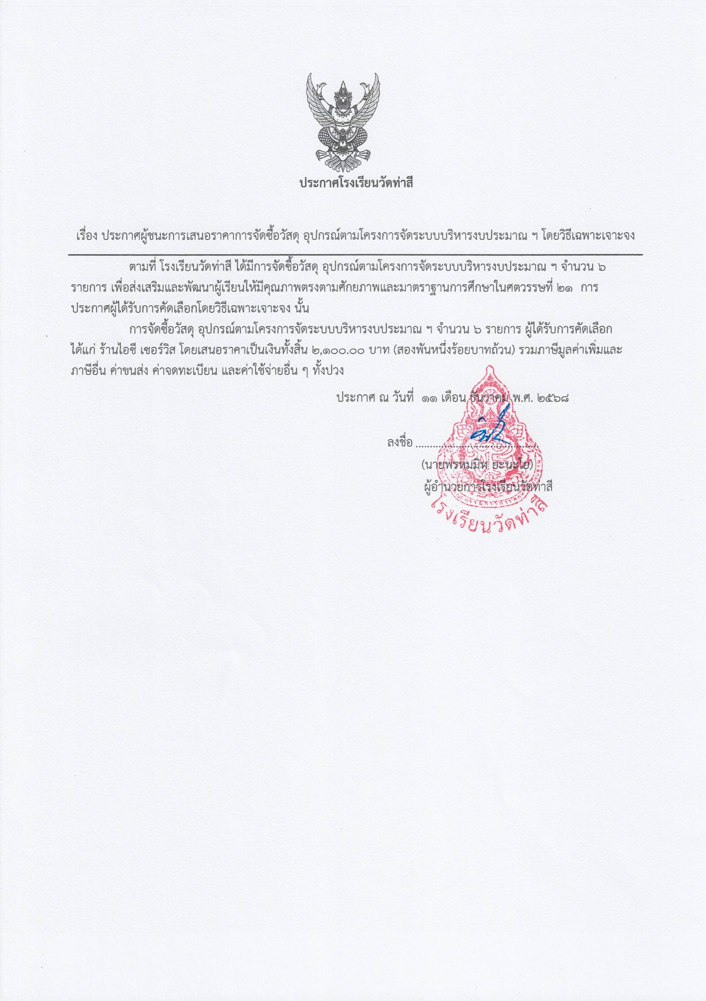 ประกาศผู้ชนะการเสนอราคาการจัดซื้อวัสดุ อุปกรณ์ตามโครงการจัดระบบบริหารงบประมาณ ฯ โดยวิธีเฉพาะเจาะจง