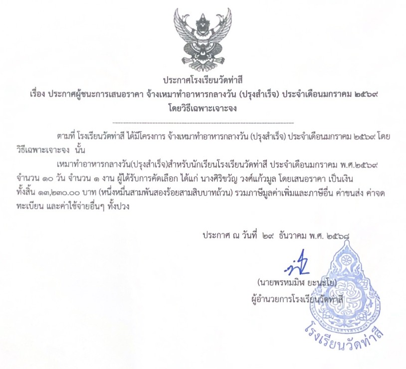 ประกาศผู้ชนะการเสนอราคา จ้างเหมาทำอาหารกลางวัน (ปรุงสำเร็จ) ประจำเดือนมกราคม ๒๕๖9 โดยวิธีเฉพาะเจาะจง