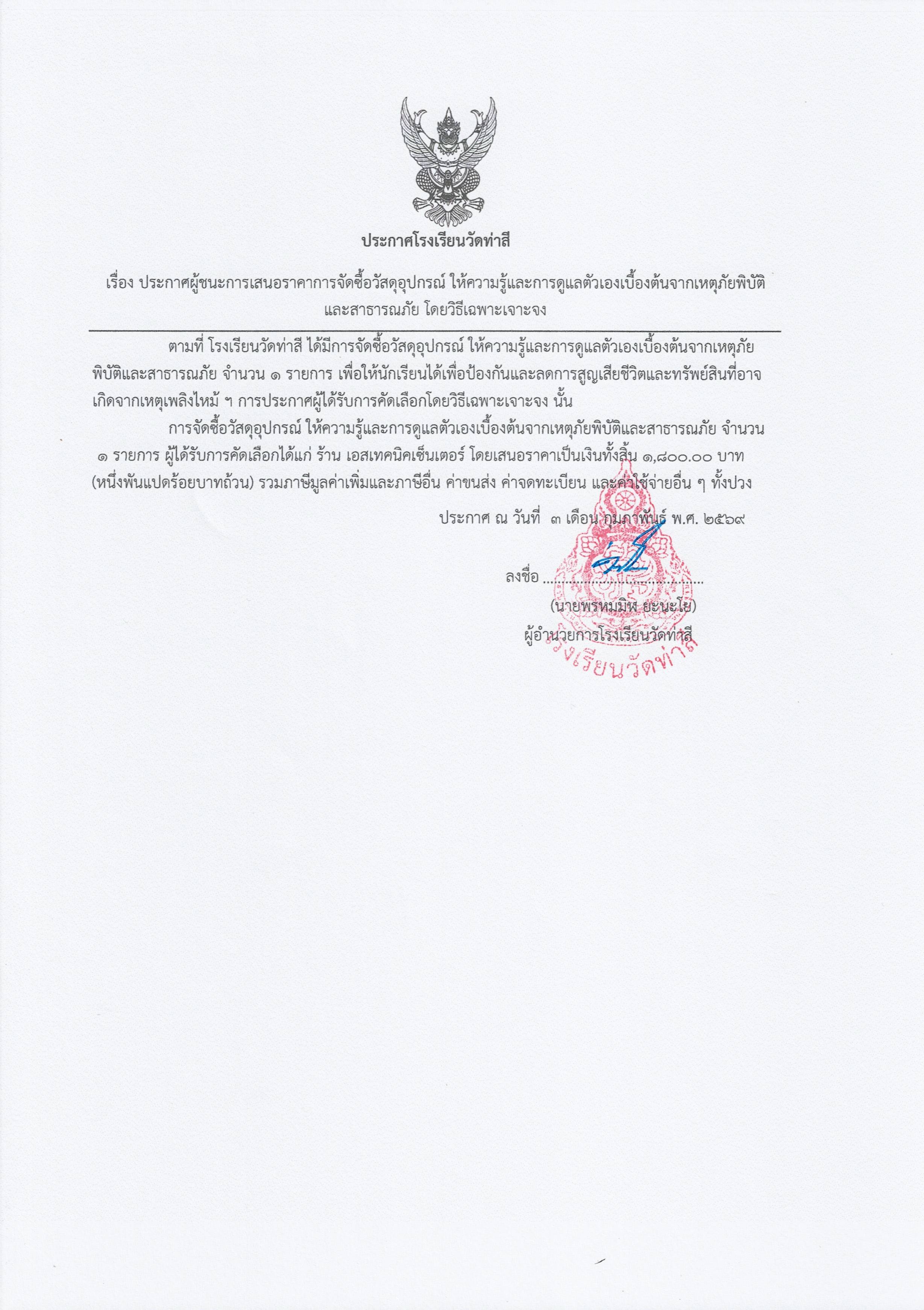 ประกาศผู้ชนะการเสนอราคาการจัดซื้อวัสดุอุปกรณ์ ให้ความรู้และการดูแลตัวเองเบื้องต้นจากเหตุภัยพิบัติและสาธารณภัยโดยวิธีเฉพาะเจาะจง