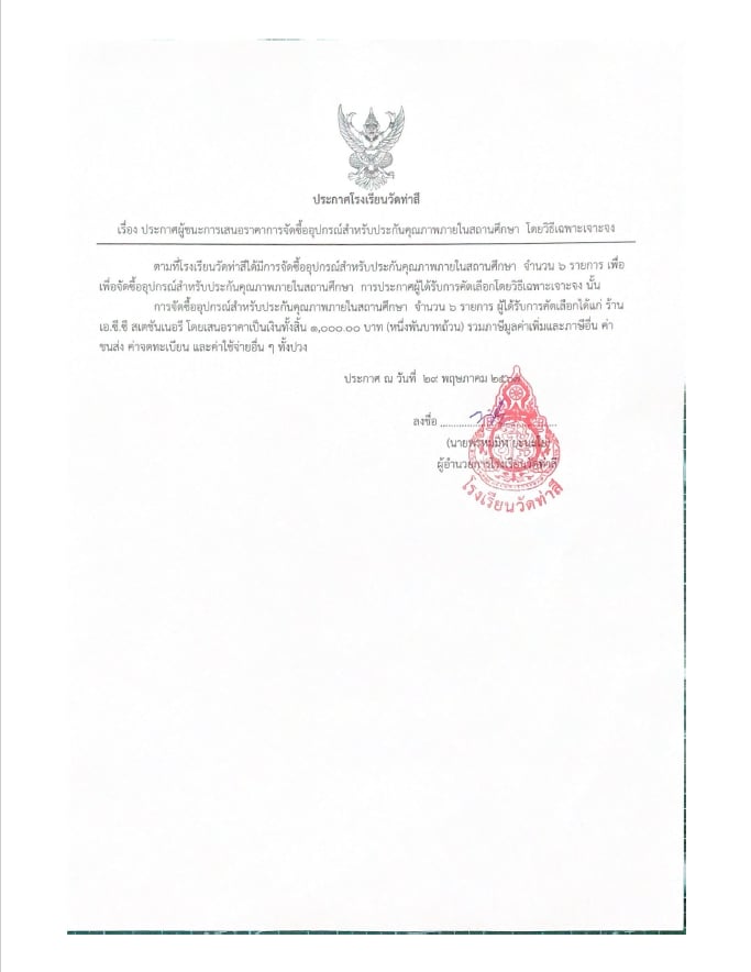 ประกาศผลผู้ชนะการเสนอราคารายการจัดซื้ออุปกรณ์สำหรับประกันคุณภาพภายในสถานศึกษา โดยวิธีเจาะจง โรงเรียนวัดท่าสี