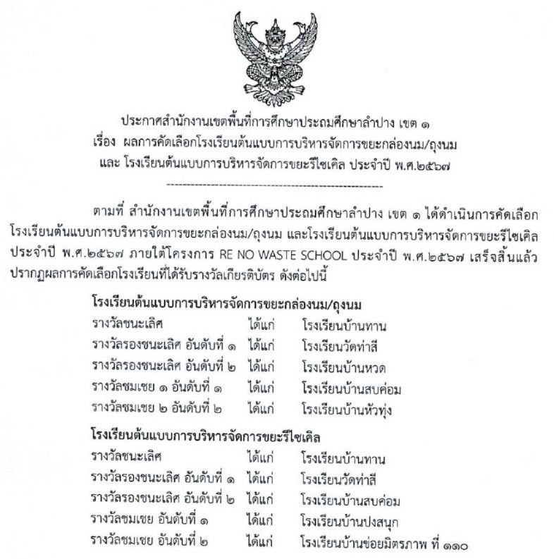 ประกาศสำนักงานเขตพื้นที่การศึกษาประถมศึกษาลำปาง เขต ๑เรื่อง ผลการคัดเลือกโรงเรียนต้นแบบการบริหารจัดการขยะกล่องนม/ถุงนม และ โรงเรียนต้นแบบการบริหารจัดการขยะรีไชเคิล ประจำปี พ.ศ.๒๕๖๗ โดยโรงเรียนวัดท่าสี ได้รับรางวัล รองชนะเลิศอันดับที่ 1 ทั้ง 2 รายการ