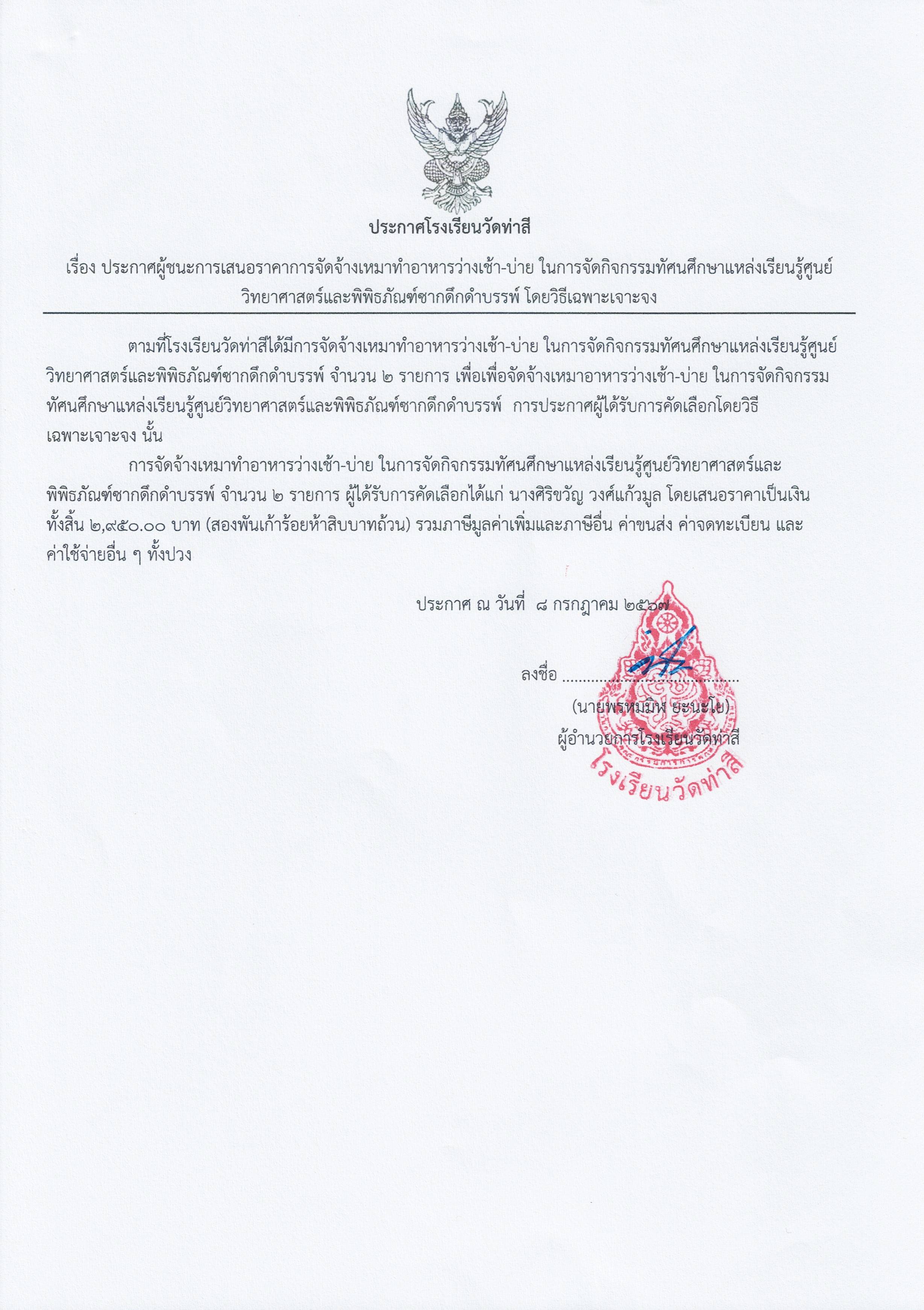 ประกาศผลผู้ชนะการเสนอราคารายการจัดจ้างเหมาทำอาหารว่างเช้า-บ่าย ในการจัดกิจกรรมทัศนศึกษาแหล่งเรียนรู้ศูนย์วิทยาศาสตร์และพิพิธภัณฑ์ซากดึกดำบรรพ์ โดยวิธีเจาะจง โรงเรียนวัดท่าสี