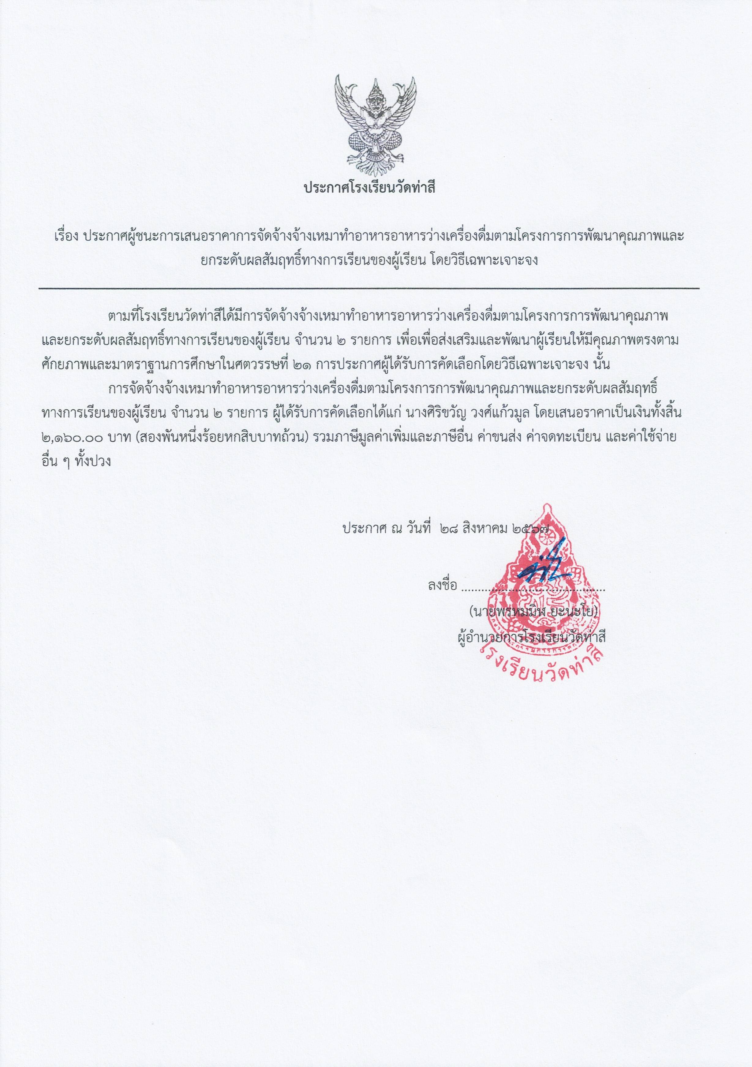 ประกาศผู้ชนะการเสนอราคา รายการจ้างเหมาทำอาหารอาหารว่างเครื่องดื่มตามโครงการการพัฒนาคุณภาพ และยกระดับผลสัมฤทธิ์ทางการเรียนของผู้เรียนปีงบประมาณ 2567 โดยวิธีเฉพาะเจาะจง