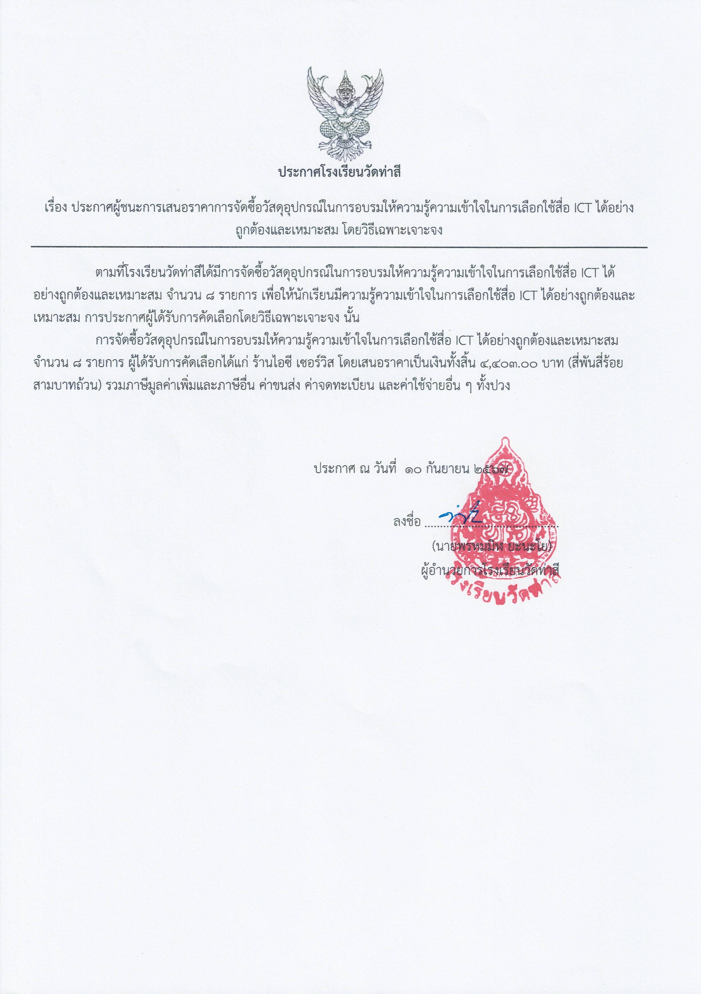 ประกาศผู้ได้รับคัดเลือกการจัดซื้อวัสดุอุปกรณ์ในการอบรมให้ความรู้ความเข้าใจในการเลือกใช้สื่อ ICT ได้อย่างถูกต้องและเหมาะสม โดยวิธีเฉพาะเจาะจง โรงเรียนวัดท่าสี