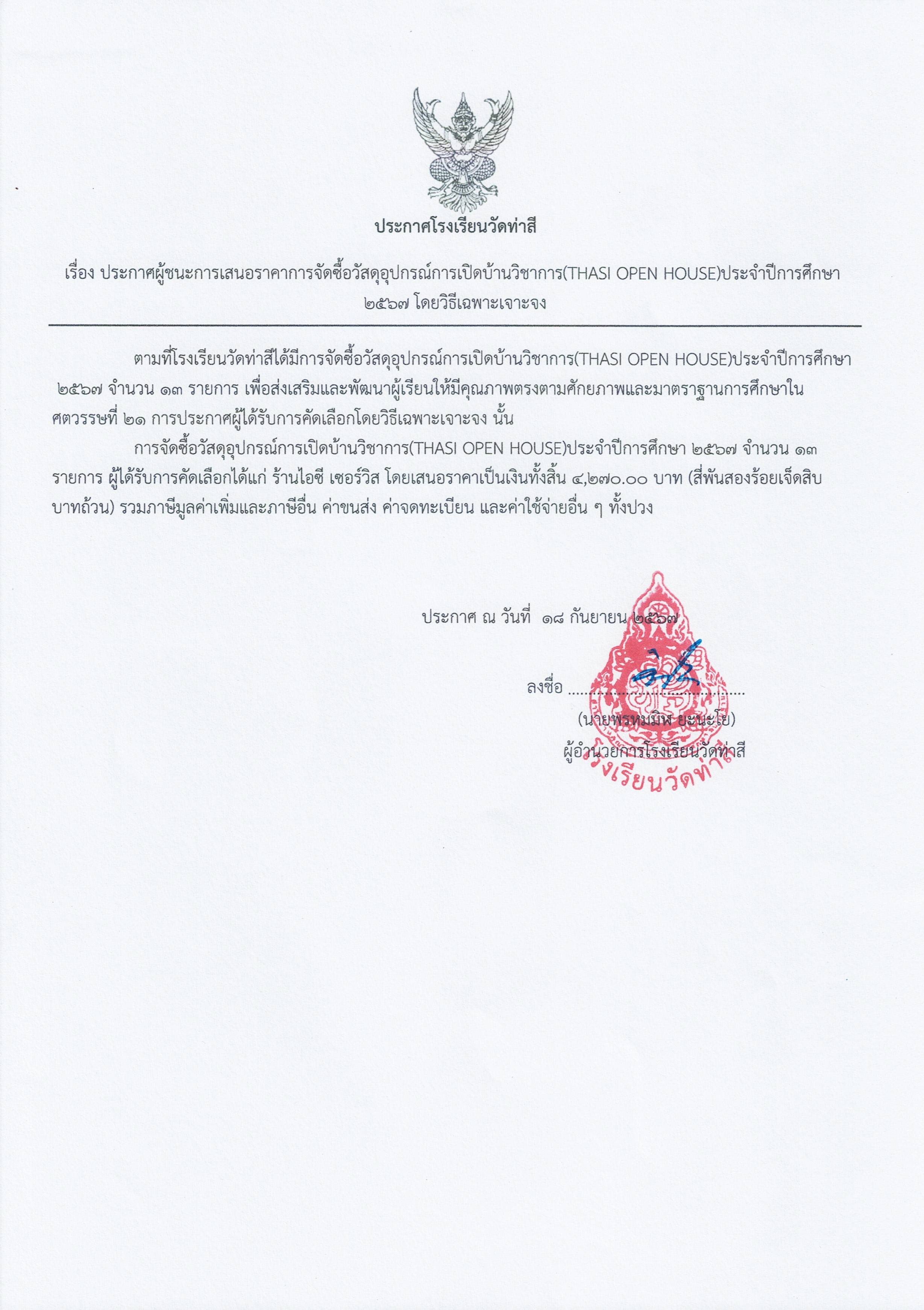 ประกาศผู้ชนะการเสนอราคา รายการจัดซื้อวัสดุอุปกรณ์การเปิดบ้านวิชาการ(THASI OPEN HOUSE)ประจำปีการศึกษา 2567