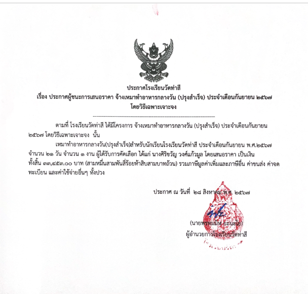 ประกาศผู้ชนะการเสนอราคา จ้างเหมาทำอาหารกลางวัน (ปรุงสำเร็จ) ประจำเดือนกันยายน ๒๕๖๗ โดยวิธีเฉพาะเจาะจง