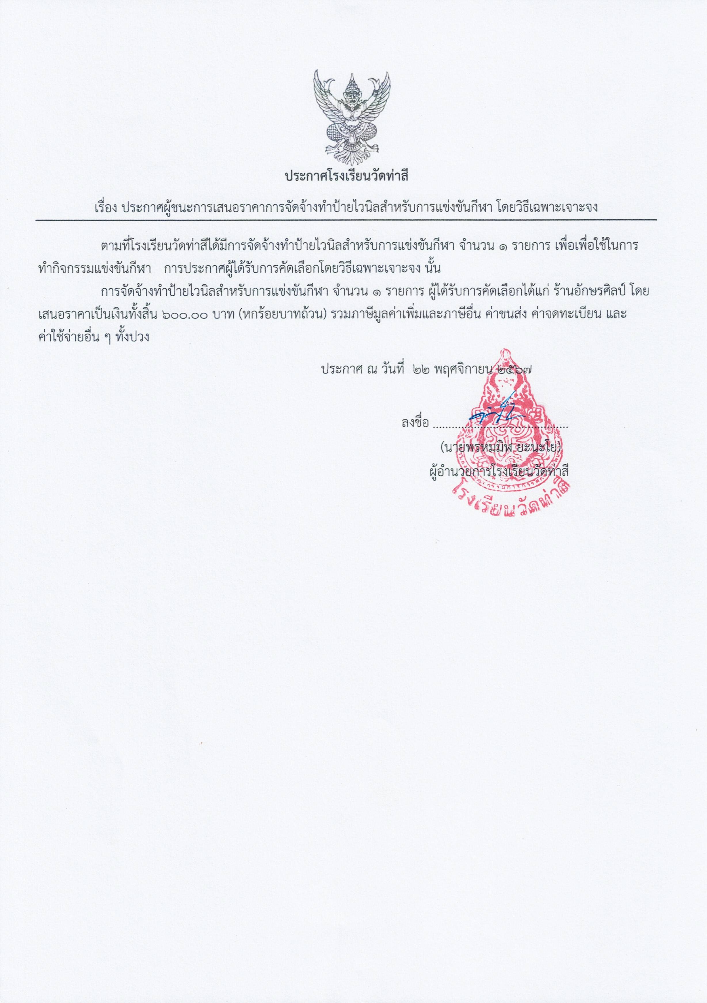ประกาศผู้ชนะการเสนอราคาการจัดจ้างทำป้ายไวนิลสำหรับการแข่งขันกีฬา โดยเฉพาะเจาะจง
