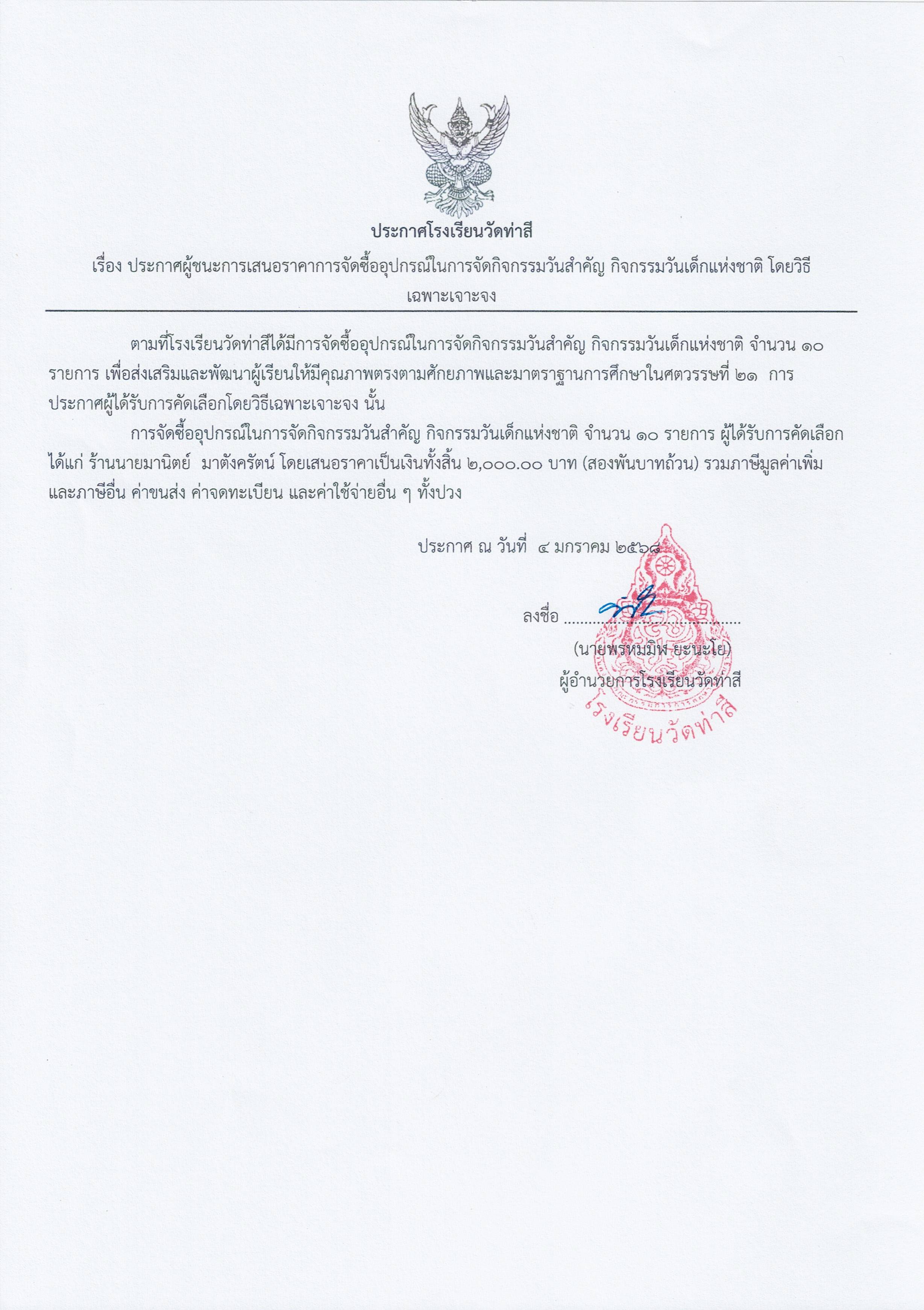 ประกาศผู้ชนะการเสนอราคาการจัดซื้ออุปกรณ์ในการจัดกิจกรรมวันสำคัญ กิจกรรมวันเด็กแห่งชาติ โรงเรียนวัดท่าสี
