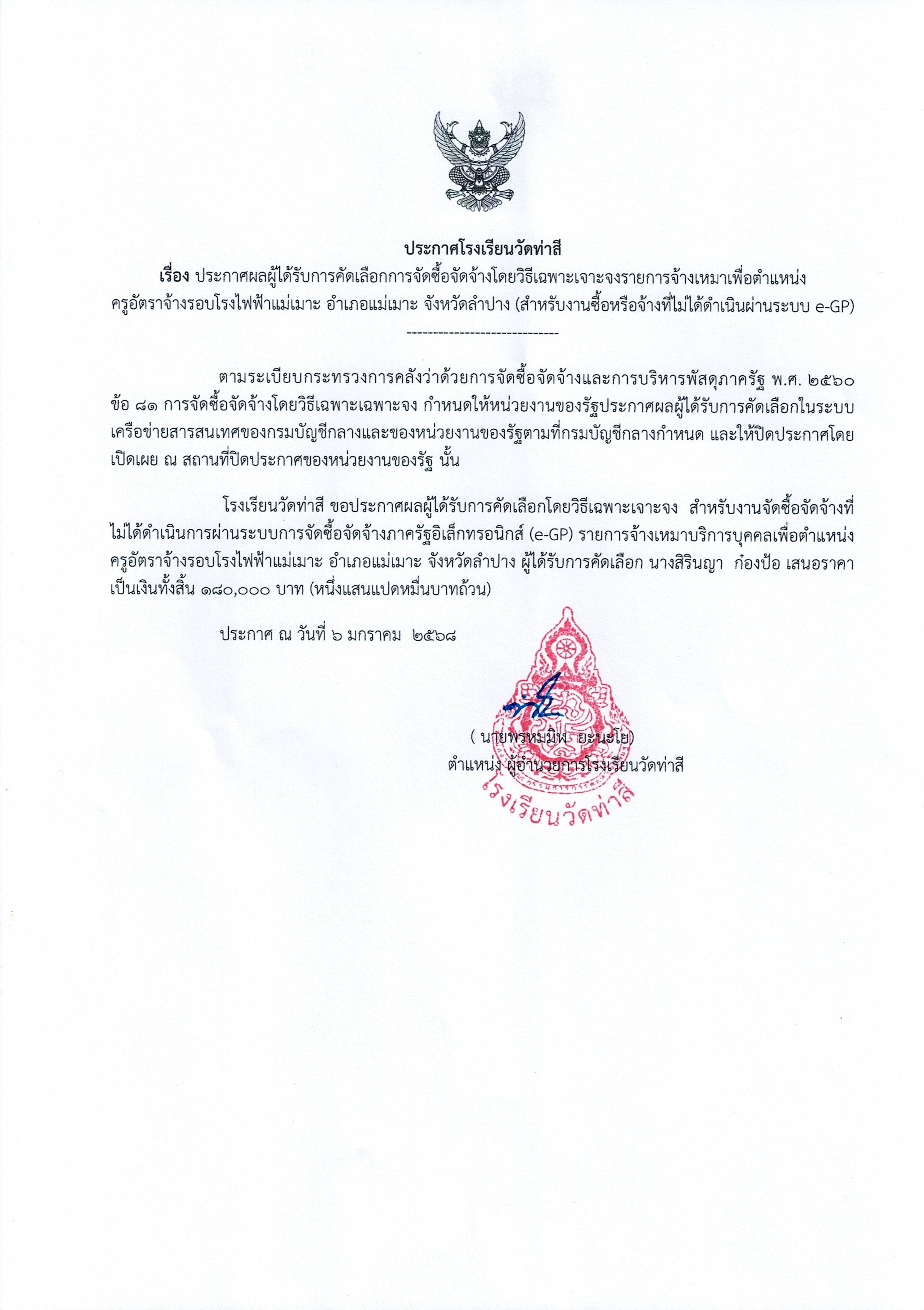 เรื่อง ประกาศผลผู้ได้รับการคัดเลือกการจัดซื้อจัดจ้างโดยวิธีเฉพาะเจาะจงรายการจ้างเหมาเพื่อตำแหน่ง ครูอัตราจ้างรอบโรงไฟฟ้าแม่เมาะ อำเภอแม่เมาะ จังหวัดลำปาง (สำหรับงานซื้อหรือจ้างที่ไม่ได้ดำเนินผ่านระบบ