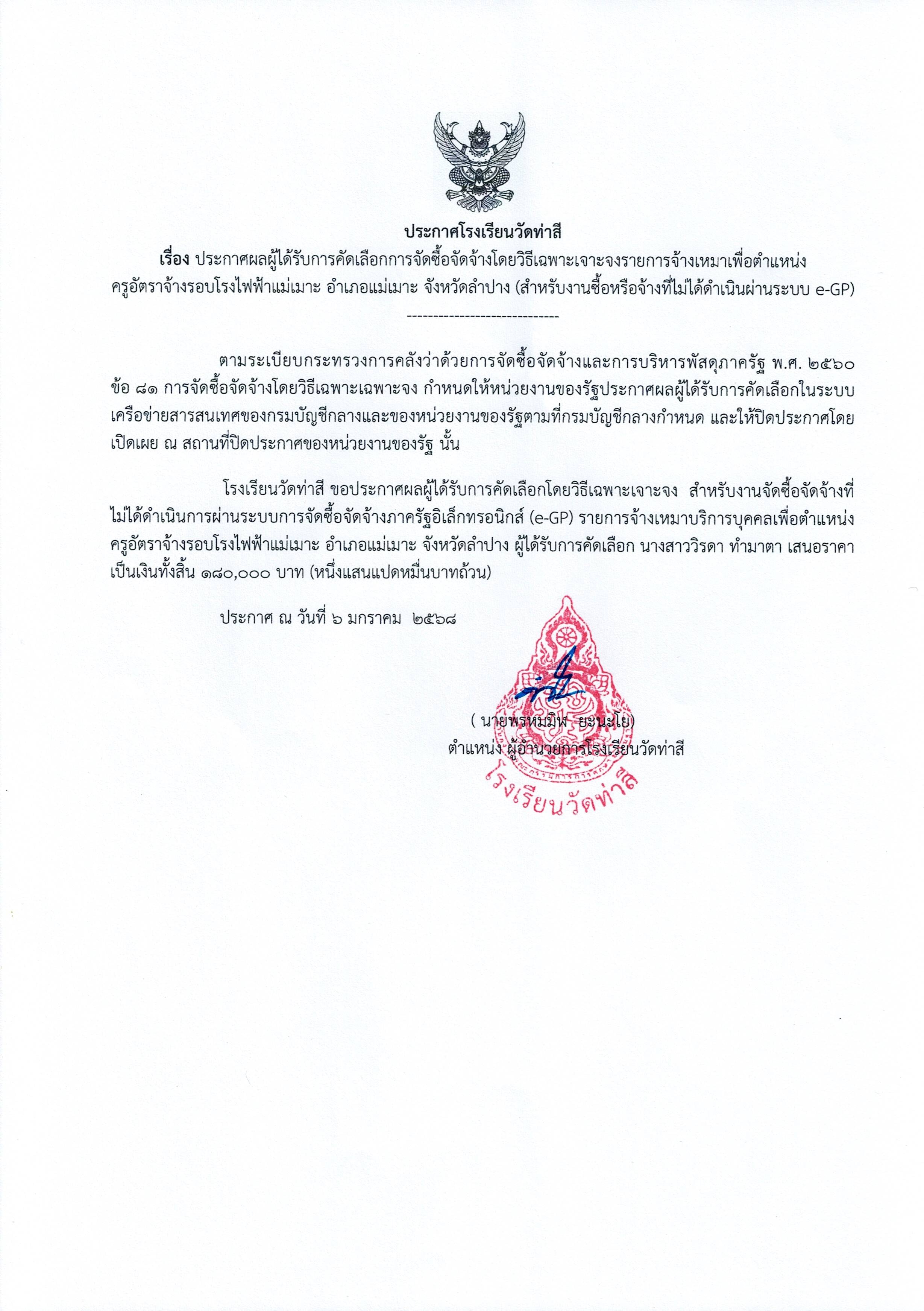 ประกาศผลผู้ได้รับการคัดเลือกการจัดซื้อจัดจ้างโดยวิธีเฉพาะเจาะจงรายการจ้างเหมาเพื่อตำแหน่ง ครูอัตราจ้างรอบโรงไฟฟ้าแม่เมาะ อำเภอแม่เมาะ จังหวัดลำปาง (สำหรับงานซื้อหรือจ้างที่ไม่ได้ดำเนินผ่านระบบ e-GP)