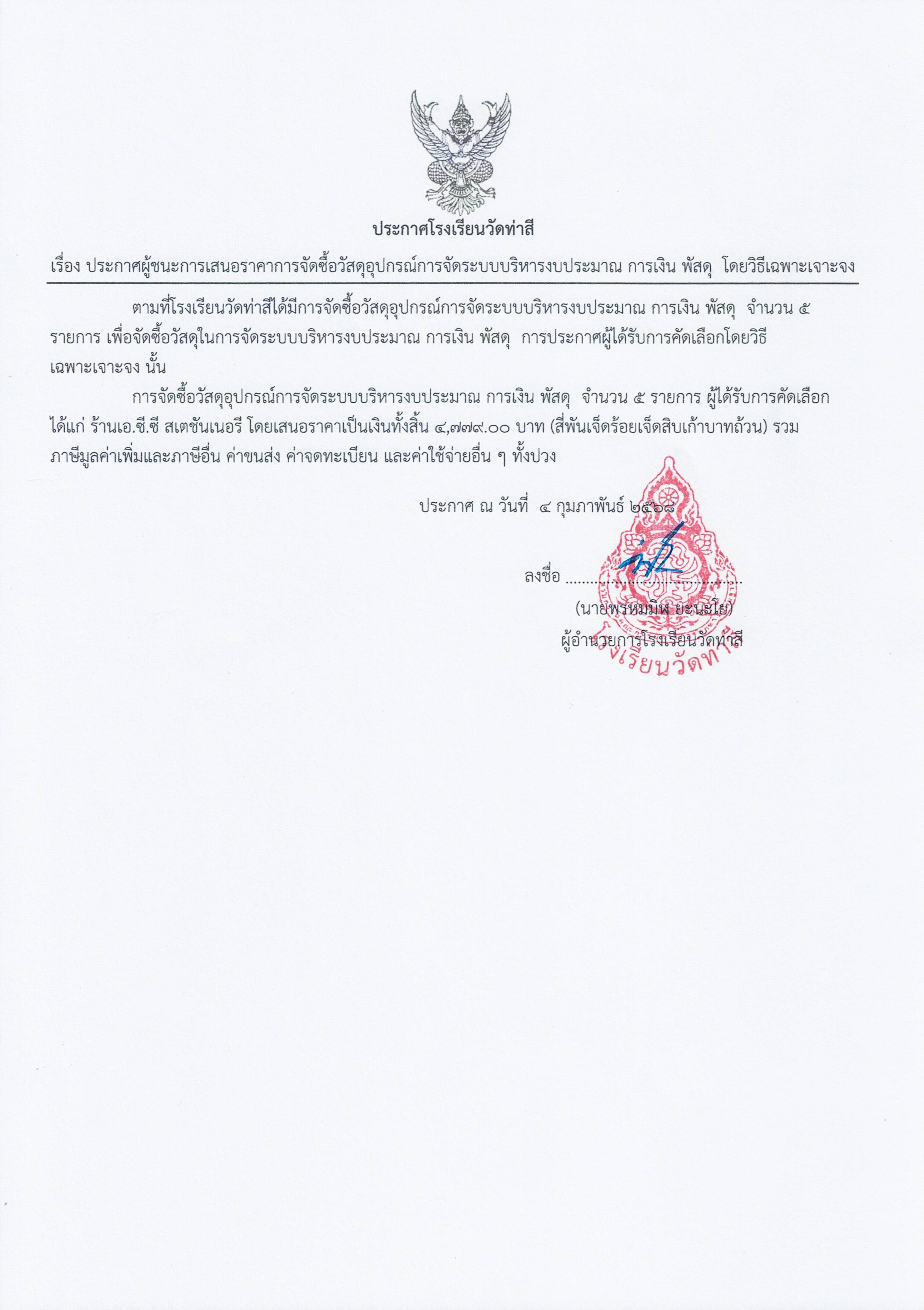 ประกาศผู้ชนะการเสนอราคาการจัดซื้อวัสดุอุปกรณ์การจัดระบบบริหารงบประมาณ การเงิน พัสดุ