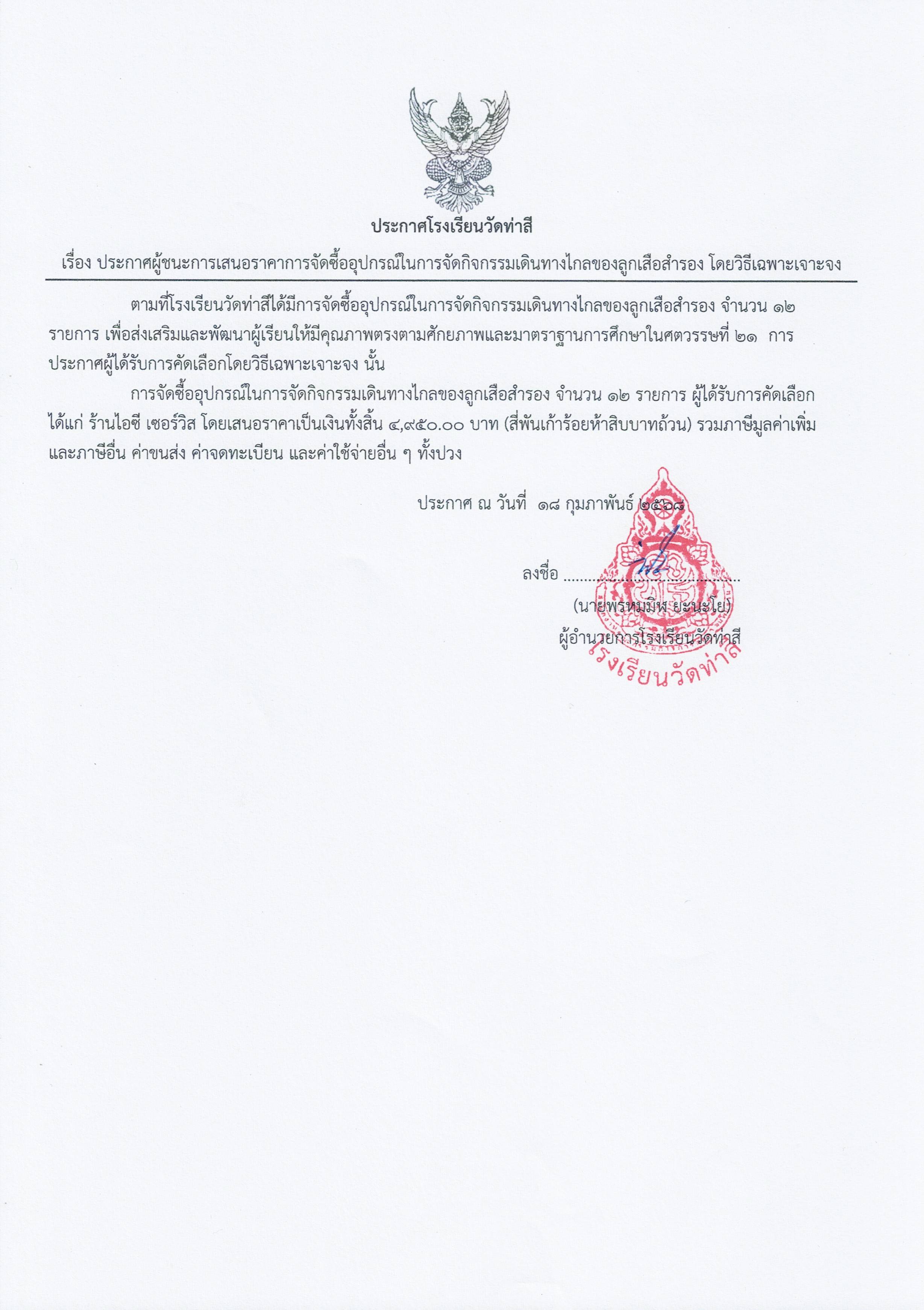 ประกาศผู้ชนะการเสนอราคาการจัดซื้ออุปกรณ์ในการจัดกิจกรรมเดินทางไกลของลูกเสือสำรอง