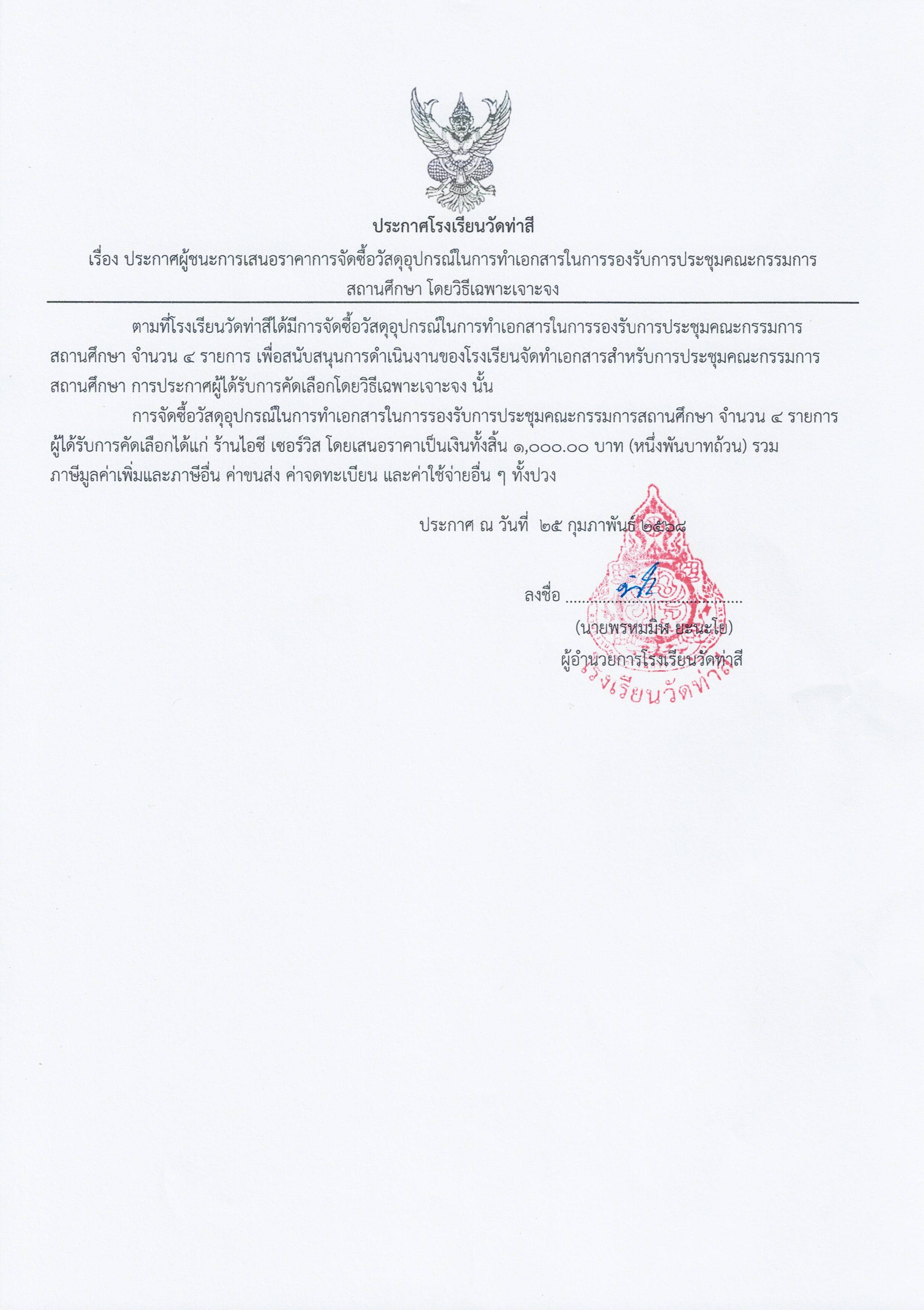 ประกาศผู้ชนะการเสนอราคา รายการจัดซื้อวัสดุอุปกรณ์ในการทำเอกสารในการรองรับการประชุมคณะกรรมการสถานศึกษา