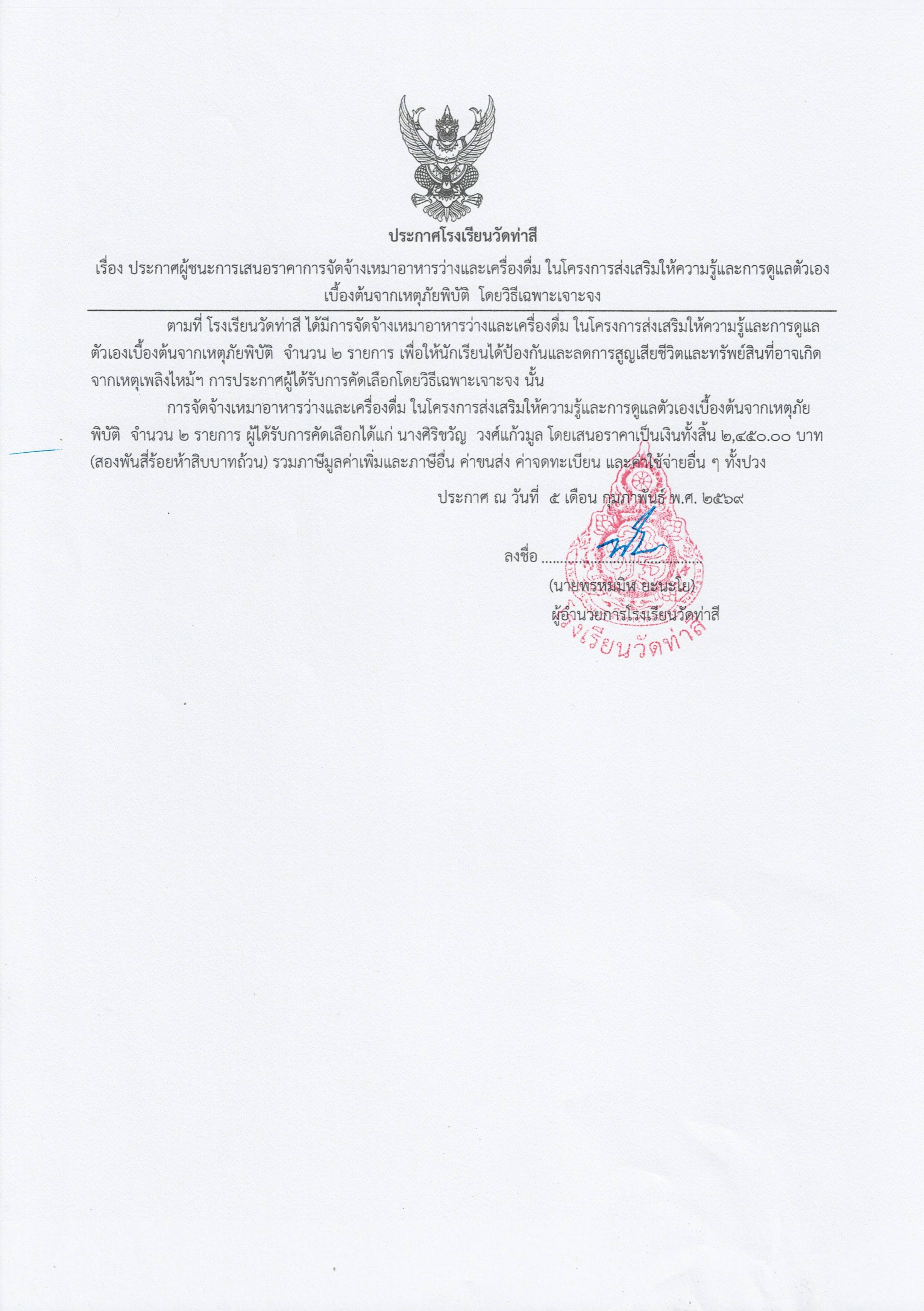 ประกาศผู้ชนะการเสนอราคาการจัดจ้างเหมาค่าอาหารและอาหารว่างและเครื่องดื่ม ให้ความรู้และการดูแลตัวเองเบื้องต้นจากเหตุภัยพิบัติและสาธารณภัย โดยเฉพาะเจาะจง