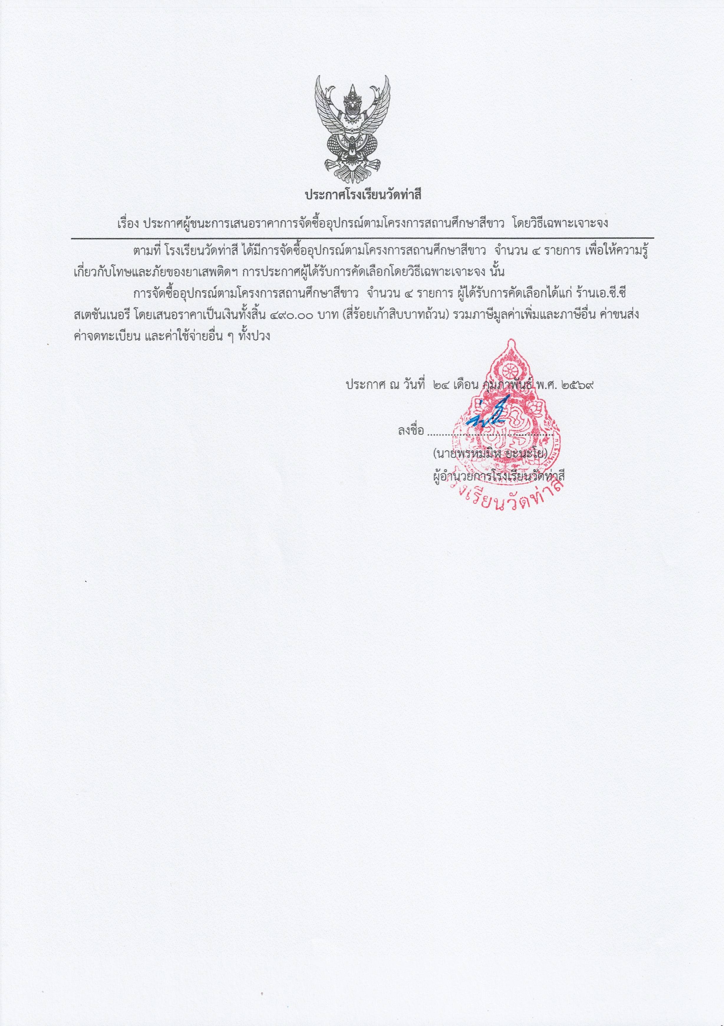 ประกาศผู้ชนะการเสนอราคาการจัดซื้ออุปกรณ์ตามโครงการสถานศึกษาสีขาว โดยเฉพาะเจาะจง