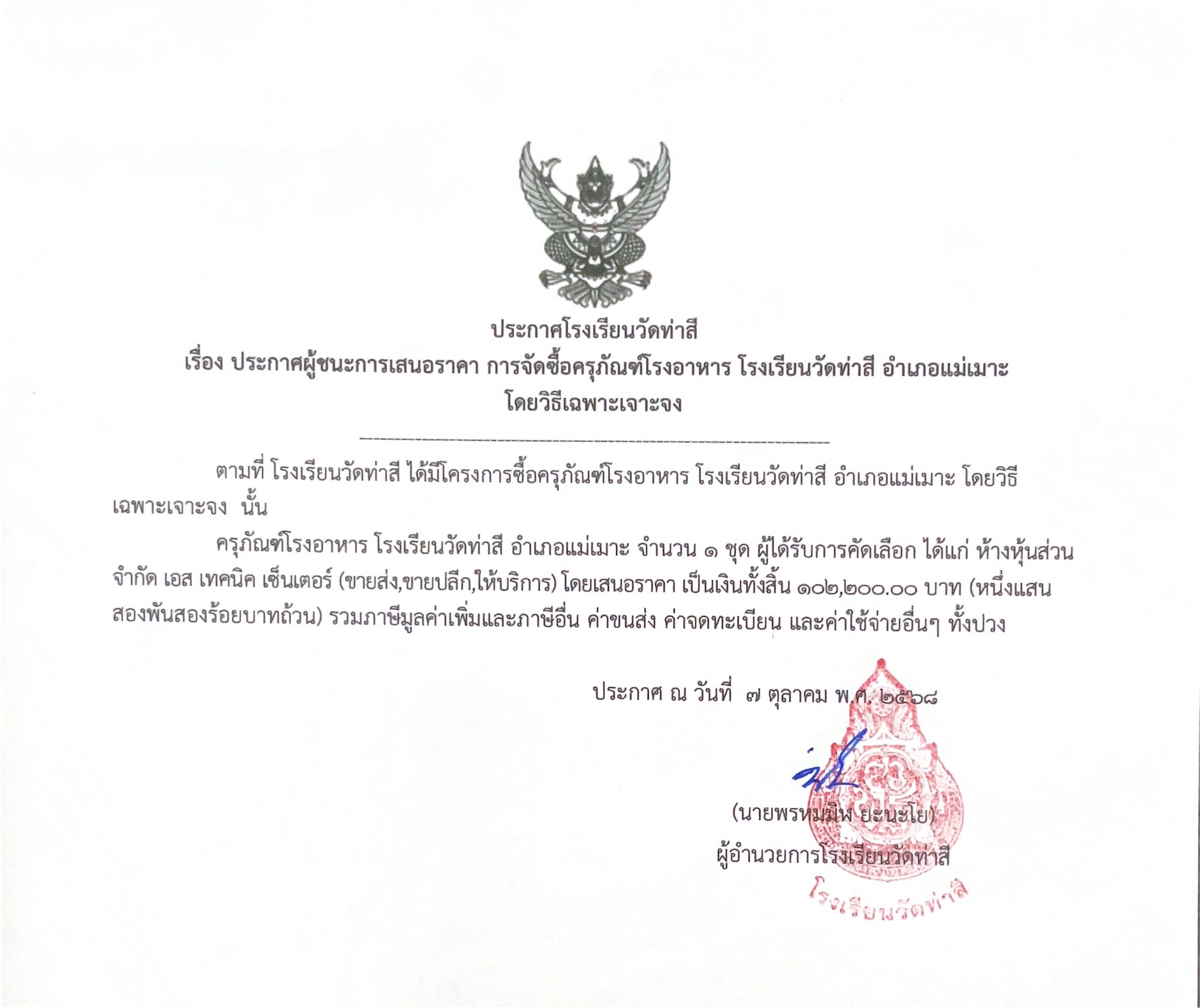 ประกาศผู้ชนะการเสนอราคา การจัดซื้อครุภัณฑ์โรงอาหาร โรงเรียนวัดท่าสี อำเภอแม่เมาะ โดยวิธีเฉพาะเจาะจง