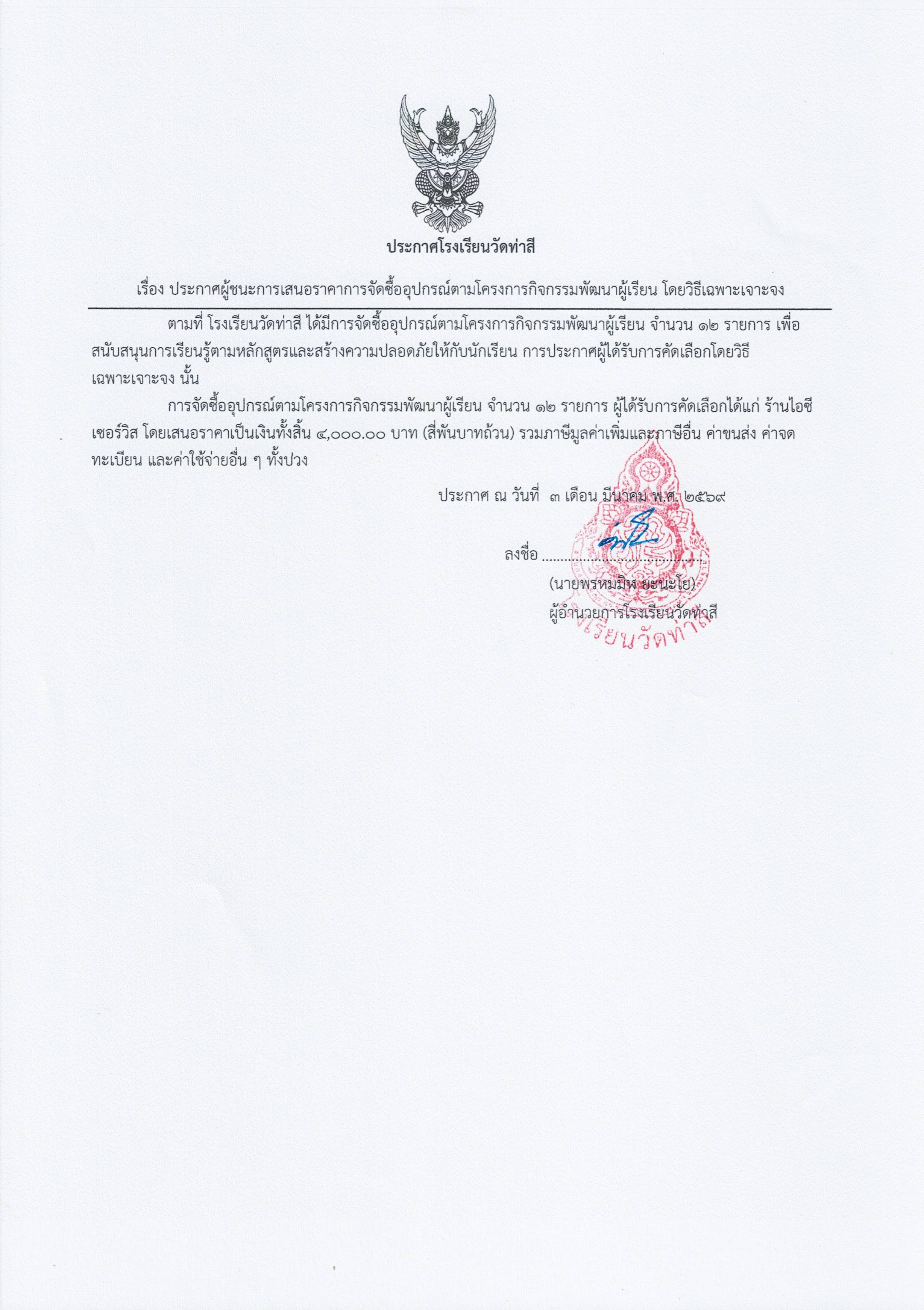 ประกาศผู้ชนะการเสนอราคาการจัดซื้ออุปกรณ์ตามโครงการกิจกรรมพัฒนาผู้เรียน กิจกรรมการเดินทางไกลของลูกเสือสำรอง โดยเฉพาะเจาะจง