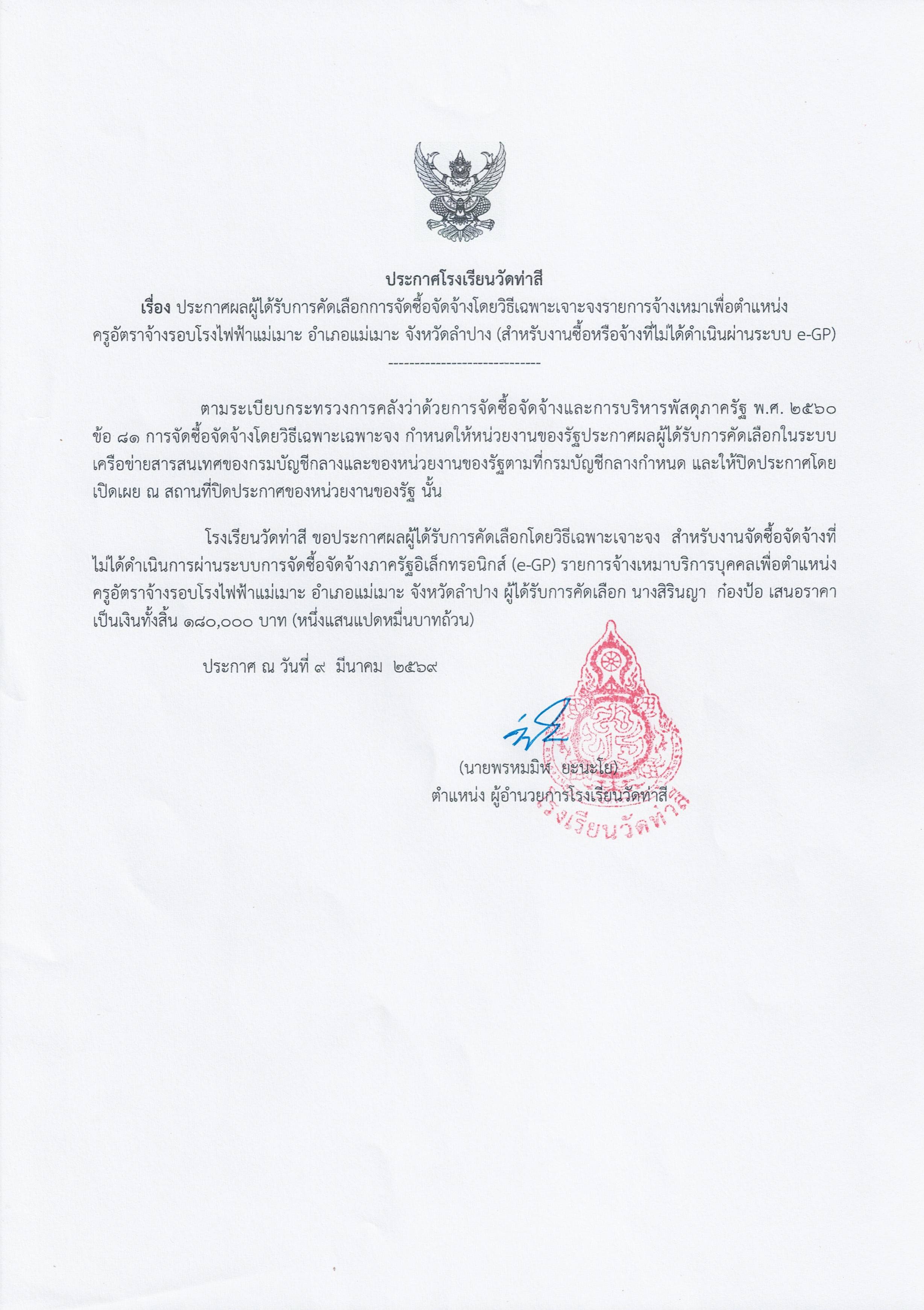 ประกาศผลผู้ได้รับการคัดเลือกการจัดซื้อจัดจ้างโดยวิธีเฉพาะเจาะจงรายการจ้างเหมาเพื่อตำแหน่ง ครูอัตราจ้างรอบโรงไฟฟ้าแม่เมาะ อำเภอแม่แม่เมาะ จังหวัดลำปาง (สำหรับงานซื้อหรือหรือจ้างที่ไม่ได้ดำเนินผ่านระบบ