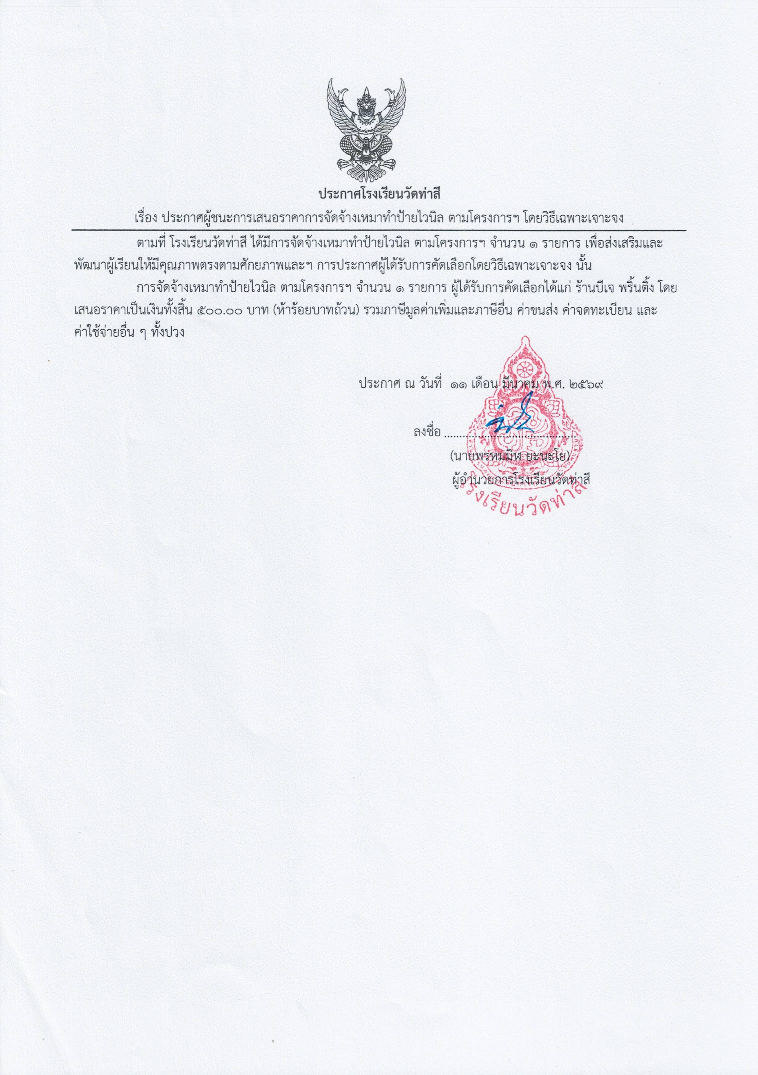 ประกาศผู้ชนะการเสนอราคา รายการจัดจ้างเหมาทำป้ายไวนิล ตามโครงการฯ โดยวิธีเฉพาะเจาะจง